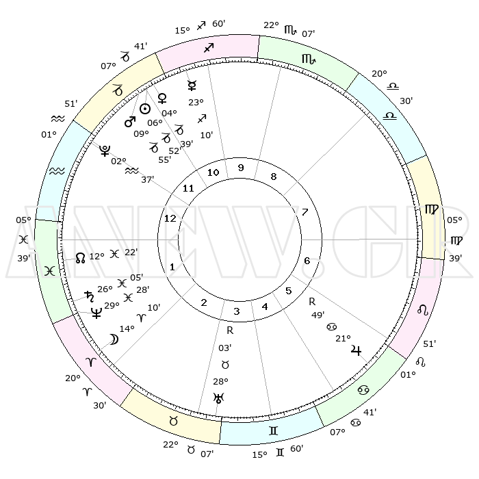 | | ΘΕΣΕΙΣ ΠΛΑΝΗΤΩΝ ΑΣΤΡΟΛΟΓΙΚΟΥ ΧΑΡΤΗ ΤΗΣ ΣΤΙΓΜΗΣ ΑΥΤΗΣ | | | | Πλανήτης | Ζώδιο | Μοίρες | Δεκαήμ. | Σε οίκο | Απόκλιση | | Ακμές των οίκων | | Ηλιος | Αιγόκερως | 06°48' | Πρώτο | 12 | 23 S 15 | | 1ος | 28°42' | Αιγόκερως | | Σελήνη | Κριός | 13°07' | Δεύτερο | 2 | 07 N 39 | | 2ος | 12°35' | Ιχθείς | | Ερμής | Τοξότης | 23°03' | Τρίτο | 11 | 23 S 24 | | 3ος | 21°14' | Κριός | | Αφροδίτη | Αιγόκερως | 04°33' | Πρώτο | 12 | 23 S 43 | | 4ος | 19°55' | Ταύρος | | Αρης | Αιγόκερως | 09°52' | Πρώτο | 12 | 23 S 56 | | 5ος | 12°47' | Δίδυμοι | | Δίας | Καρκίνος | 21°50'R | Τρίτο | 6 | 21 N 53 | | 6ος | 04°09' | Καρκίνος | | Κρόνος | Ιχθείς | 26°05' | Τρίτο | 2 | 03 S 39 | | 7ος | 28°42' | Καρκίνος | | Ουρανός | Ταύρος | 28°03'R | Τρίτο | 4 | 19 N 32 | | 8ος | 12°35' | Παρθένος | | Ποσειδώνας | Ιχθείς | 29°28' | Τρίτο | 2 | 01 S 26 | | 9ος | 21°14' | Ζυγός | | Πλούτωνας | Υδροχόος | 02°37' | Πρώτο | 1 | 23 S 15 | | 10ος | 19°55' | Σκορπιός | | Β. Δεσμός | Ιχθείς | 12°22' | Δεύτερο | 1 | 06 S 55 | | 11ος | 12°47' | Τοξότης | | Ωροσκόπος | Αιγόκερως | 28°42' | Τρίτο | | | 12ος | 04°09' | Αιγόκερως | | Μεσουράνημα | Σκορπιός | 19°55' | Δεύτερο | | | |