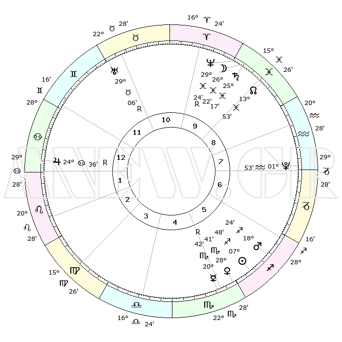 | | ΘΕΣΕΙΣ ΠΛΑΝΗΤΩΝ ΑΣΤΡΟΛΟΓΙΚΟΥ ΧΑΡΤΗ ΤΗΣ ΣΤΙΓΜΗΣ ΑΥΤΗΣ | | | | Πλανήτης | Ζώδιο | Μοίρες | Δεκαήμ. | Σε οίκο | Απόκλιση | | Ακμές των οίκων | | Ηλιος | Τοξότης | 07°47' | Πρώτο | 5 | 21 S 36 | | 1ος | 22°18' | Καρκίνος | | Σελήνη | Ιχθείς | 26°02' | Τρίτο | 9 | 00 S 38 | | 2ος | 12°55' | Λέων | | Ερμής | Σκορπιός | 20°42'R | Τρίτο | 5 | 15 S 28 | | 3ος | 06°57' | Παρθένος | | Αφροδίτη | Σκορπιός | 28°39' | Τρίτο | 5 | 19 S 07 | | 4ος | 06°55' | Ζυγός | | Αρης | Τοξότης | 18°23' | Δεύτερο | 5 | 23 S 35 | | 5ος | 12°58' | Σκορπιός | | Δίας | Καρκίνος | 24°36'R | Τρίτο | 1 | 21 N 21 | | 6ος | 19°58' | Τοξότης | | Κρόνος | Ιχθείς | 25°17' | Τρίτο | 9 | 04 S 03 | | 7ος | 22°18' | Αιγόκερως | | Ουρανός | Ταύρος | 29°06'R | Τρίτο | 11 | 19 N 45 | | 8ος | 12°55' | Υδροχόος | | Ποσειδώνας | Ιχθείς | 29°24'R | Τρίτο | 9 | 01 S 29 | | 9ος | 06°57' | Ιχθείς | | Πλούτωνας | Υδροχόος | 01°53' | Πρώτο | 7 | 23 S 24 | | 10ος | 06°55' | Κριός | | Β. Δεσμός | Ιχθείς | 13°53' | Δεύτερο | 9 | 06 S 20 | | 11ος | 12°58' | Ταύρος | | Ωροσκόπος | Καρκίνος | 22°18' | Τρίτο | | | 12ος | 19°58' | Δίδυμοι | | Μεσουράνημα | Κριός | 06°55' | Πρώτο | | | |