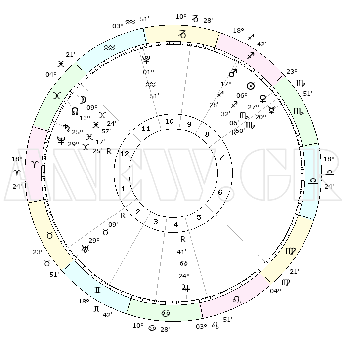 | | ΘΕΣΕΙΣ ΠΛΑΝΗΤΩΝ ΑΣΤΡΟΛΟΓΙΚΟΥ ΧΑΡΤΗ ΤΗΣ ΣΤΙΓΜΗΣ ΑΥΤΗΣ | | | | Πλανήτης | Ζώδιο | Μοίρες | Δεκαήμ. | Σε οίκο | Απόκλιση | | Ακμές των οίκων | | Ηλιος | Τοξότης | 06°30' | Πρώτο | 8 | 21 S 23 | | 1ος | 00°34' | Κριός | | Σελήνη | Ιχθείς | 09°00' | Πρώτο | 12 | 08 S 38 | | 2ος | 10°44' | Ταύρος | | Ερμής | Σκορπιός | 20°51'R | Τρίτο | 8 | 15 S 36 | | 3ος | 08°02' | Δίδυμοι | | Αφροδίτη | Σκορπιός | 27°04' | Τρίτο | 8 | 18 S 44 | | 4ος | 00°19' | Καρκίνος | | Αρης | Τοξότης | 17°27' | Δεύτερο | 9 | 23 S 29 | | 5ος | 22°39' | Καρκίνος | | Δίας | Καρκίνος | 24°41'R | Τρίτο | 5 | 21 N 20 | | 6ος | 20°09' | Λέων | | Κρόνος | Ιχθείς | 25°17' | Τρίτο | 12 | 04 S 03 | | 7ος | 00°34' | Ζυγός | | Ουρανός | Ταύρος | 29°09'R | Τρίτο | 2 | 19 N 46 | | 8ος | 10°44' | Σκορπιός | | Ποσειδώνας | Ιχθείς | 29°25'R | Τρίτο | 12 | 01 S 29 | | 9ος | 08°02' | Τοξότης | | Πλούτωνας | Υδροχόος | 01°51' | Πρώτο | 11 | 23 S 25 | | 10ος | 00°19' | Αιγόκερως | | Β. Δεσμός | Ιχθείς | 13°57' | Δεύτερο | 12 | 06 S 19 | | 11ος | 22°39' | Αιγόκερως | | Ωροσκόπος | Κριός | 00°34' | Πρώτο | | | 12ος | 20°09' | Υδροχόος | | Μεσουράνημα | Αιγόκερως | 00°19' | Πρώτο | | | |