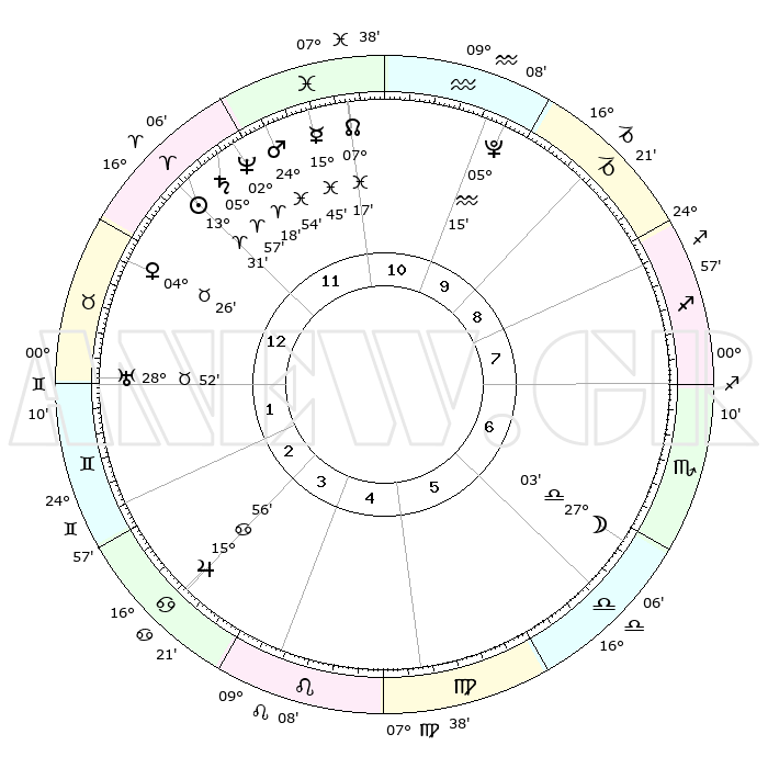 | | ΘΕΣΕΙΣ ΠΛΑΝΗΤΩΝ ΑΣΤΡΟΛΟΓΙΚΟΥ ΧΑΡΤΗ ΤΗΣ ΣΤΙΓΜΗΣ ΑΥΤΗΣ | | | | Πλανήτης | Ζώδιο | Μοίρες | Δεκαήμ. | Σε οίκο | Απόκλιση | | Ακμές των οίκων | | Ηλιος | Κριός | 13°27' | Δεύτερο | 12 | 05 N 18 | | 1ος | 22°05' | Κριός | | Σελήνη | Ζυγός | 26°05' | Τρίτο | 7 | 13 S 38 | | 2ος | 26°31' | Ταύρος | | Ερμής | Ιχθείς | 15°41' | Δεύτερο | 12 | 07 S 09 | | 3ος | 20°56' | Δίδυμοι | | Αφροδίτη | Ταύρος | 04°21' | Πρώτο | 1 | 12 N 38 | | 4ος | 12°39' | Καρκίνος | | Αρης | Ιχθείς | 24°50' | Τρίτο | 12 | 03 S 00 | | 5ος | 06°20' | Λέων | | Δίας | Καρκίνος | 15°56' | Δεύτερο | 4 | 22 N 51 | | 6ος | 07°31' | Παρθένος | | Κρόνος | Κριός | 05°56' | Πρώτο | 12 | 00 N 24 | | 7ος | 22°05' | Ζυγός | | Ουρανός | Ταύρος | 28°52' | Τρίτο | 2 | 19 N 44 | | 8ος | 26°31' | Σκορπιός | | Ποσειδώνας | Κριός | 02°18' | Πρώτο | 12 | 00 S 17 | | 9ος | 20°56' | Τοξότης | | Πλούτωνας | Υδροχόος | 05°15' | Πρώτο | 10 | 22 S 47 | | 10ος | 12°39' | Αιγόκερως | | Β. Δεσμός | Ιχθείς | 07°17' | Πρώτο | 11 | 08 S 50 | | 11ος | 06°20' | Υδροχόος | | Ωροσκόπος | Κριός | 22°05' | Τρίτο | | | 12ος | 07°31' | Ιχθείς | | Μεσουράνημα | Αιγόκερως | 12°39' | Δεύτερο | | | |