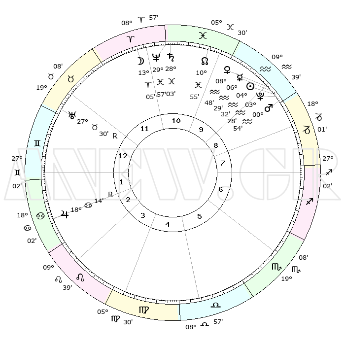 | | ΘΕΣΕΙΣ ΠΛΑΝΗΤΩΝ ΑΣΤΡΟΛΟΓΙΚΟΥ ΧΑΡΤΗ ΤΗΣ ΣΤΙΓΜΗΣ ΑΥΤΗΣ | | | | Πλανήτης | Ζώδιο | Μοίρες | Δεκαήμ. | Σε οίκο | Απόκλιση | | Ακμές των οίκων | | Ηλιος | Υδροχόος | 04°27' | Πρώτο | 9 | 19 S 09 | | 1ος | 26°47' | Ταύρος | | Σελήνη | Κριός | 12°01' | Δεύτερο | 11 | 07 N 20 | | 2ος | 22°16' | Δίδυμοι | | Ερμής | Υδροχόος | 06°21' | Πρώτο | 10 | 20 S 42 | | 3ος | 13°49' | Καρκίνος | | Αφροδίτη | Υδροχόος | 08°42' | Πρώτο | 10 | 19 S 16 | | 4ος | 06°21' | Λέων | | Αρης | Υδροχόος | 00°50' | Πρώτο | 9 | 20 S 57 | | 5ος | 04°16' | Παρθένος | | Δίας | Καρκίνος | 18°15'R | Δεύτερο | 3 | 22 N 29 | | 6ος | 12°12' | Ζυγός | | Κρόνος | Ιχθείς | 28°03' | Τρίτο | 11 | 02 S 47 | | 7ος | 26°47' | Σκορπιός | | Ουρανός | Ταύρος | 27°30'R | Τρίτο | 1 | 19 N 25 | | 8ος | 22°16' | Τοξότης | | Ποσειδώνας | Ιχθείς | 29°57' | Τρίτο | 11 | 01 S 14 | | 9ος | 13°49' | Αιγόκερως | | Πλούτωνας | Υδροχόος | 03°28' | Πρώτο | 9 | 23 S 04 | | 10ος | 06°21' | Υδροχόος | | Β. Δεσμός | Ιχθείς | 10°56' | Δεύτερο | 11 | 07 S 28 | | 11ος | 04°16' | Ιχθείς | | Ωροσκόπος | Ταύρος | 26°47' | Τρίτο | | | 12ος | 12°12' | Κριός | | Μεσουράνημα | Υδροχόος | 06°21' | Πρώτο | | | |