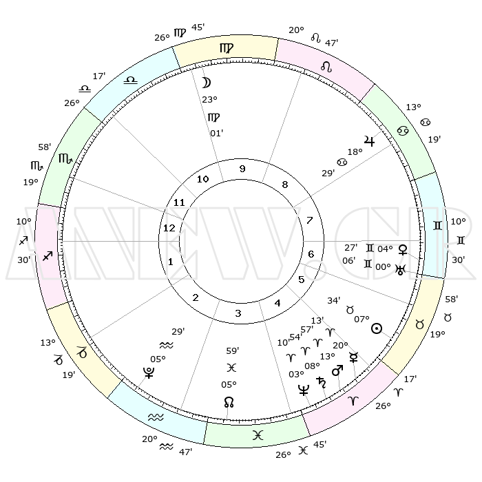 | | ΘΕΣΕΙΣ ΠΛΑΝΗΤΩΝ ΑΣΤΡΟΛΟΓΙΚΟΥ ΧΑΡΤΗ ΤΗΣ ΣΤΙΓΜΗΣ ΑΥΤΗΣ | | | | Πλανήτης | Ζώδιο | Μοίρες | Δεκαήμ. | Σε οίκο | Απόκλιση | | Ακμές των οίκων | | Ηλιος | Ταύρος | 07°30' | Πρώτο | 6 | 14 N 01 | | 1ος | 22°32' | Σκορπιός | | Σελήνη | Παρθένος | 22°15' | Τρίτο | 10 | 01 N 52 | | 2ος | 22°45' | Τοξότης | | Ερμής | Κριός | 20°06' | Τρίτο | 5 | 05 N 47 | | 3ος | 27°16' | Αιγόκερως | | Αφροδίτη | Δίδυμοι | 04°23' | Πρώτο | 7 | 21 N 45 | | 4ος | 03°01' | Ιχθείς | | Αρης | Κριός | 13°54' | Δεύτερο | 5 | 04 N 39 | | 5ος | 04°52' | Κριός | | Δίας | Καρκίνος | 18°29' | Δεύτερο | 8 | 22 N 33 | | 6ος | 00°56' | Ταύρος | | Κρόνος | Κριός | 08°54' | Πρώτο | 5 | 01 N 32 | | 7ος | 22°32' | Ταύρος | | Ουρανός | Δίδυμοι | 00°06' | Πρώτο | 7 | 20 N 00 | | 8ος | 22°45' | Δίδυμοι | | Ποσειδώνας | Κριός | 03°10' | Πρώτο | 4 | 00 N 03 | | 9ος | 27°16' | Καρκίνος | | Πλούτωνας | Υδροχόος | 05°29' | Πρώτο | 3 | 22 S 48 | | 10ος | 03°01' | Παρθένος | | Β. Δεσμός | Ιχθείς | 05°59' | Πρώτο | 4 | 09 S 19 | | 11ος | 04°52' | Ζυγός | | Ωροσκόπος | Σκορπιός | 22°32' | Τρίτο | | | 12ος | 00°56' | Σκορπιός | | Μεσουράνημα | Παρθένος | 03°01' | Πρώτο | | | |