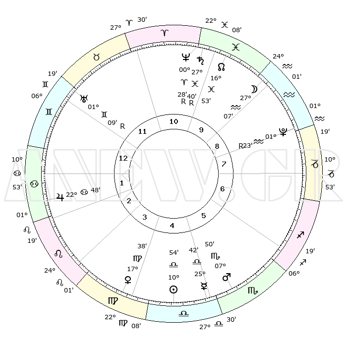 | ΘΕΣΕΙΣ ΠΛΑΝΗΤΩΝ ΑΣΤΡΟΛΟΓΙΚΟΥ ΧΑΡΤΗ ΤΗΣ ΣΤΙΓΜΗΣ ΑΥΤΗΣ | | Πλανήτης | Ζώδιο | Μοίρες | Δεκαήμ. | Σε οίκο | Απόκλιση | | Ακμές των οίκων | Ηλιος | Ζυγός | 10°51' | Δεύτερο | 5 | 04 S 18 | | 1ος | 21°27' | Δίδυμοι | Σελήνη | Υδροχόος | 26°18' | Τρίτο | 9 | 14 S 36 | | 2ος | 12°56' | Καρκίνος | Ερμής | Ζυγός | 25°37' | Τρίτο | 5 | 10 S 19 | | 3ος | 04°19' | Λέων | Αφροδίτη | Παρθένος | 17°33' | Δεύτερο | 4 | 06 N 10 | | 4ος | 29°21' | Λέων | Αρης | Σκορπιός | 07°48' | Πρώτο | 5 | 14 S 13 | | 5ος | 01°48' | Ζυγός | Δίας | Καρκίνος | 22°48' | Τρίτο | 2 | 21 N 32 | | 6ος | 12°06' | Σκορπιός | Κρόνος | Ιχθείς | 27°41'R | Τρίτο | 10 | 03 S 14 | | 7ος | 21°27' | Τοξότης | Ουρανός | Δίδυμοι | 01°09'R | Πρώτο | 12 | 20 N 11 | | 8ος | 12°56' | Αιγόκερως | Ποσειδώνας | Κριός | 00°28'R | Πρώτο | 10 | 01 S 04 | | 9ος | 04°19' | Υδροχόος | Πλούτωνας | Υδροχόος | 01°23'R | Πρώτο | 8 | 23 S 32 | | 10ος | 29°21' | Υδροχόος | Β. Δεσμός | Ιχθείς | 16°54' | Δεύτερο | 10 | 05 S 10 | | 11ος | 01°48' | Κριός | Ωροσκόπος | Δίδυμοι | 21°27' | Τρίτο | | | 12ος | 12°06' | Ταύρος | Μεσουράνημα | Υδροχόος | 29°21' | Τρίτο | | | |