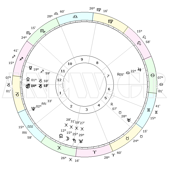 | | ΘΕΣΕΙΣ ΠΛΑΝΗΤΩΝ ΑΣΤΡΟΛΟΓΙΚΟΥ ΧΑΡΤΗ ΤΗΣ ΣΤΙΓΜΗΣ ΑΥΤΗΣ | | | | Πλανήτης | Ζώδιο | Μοίρες | Δεκαήμ. | Σε οίκο | Απόκλιση | | Ακμές των οίκων | | Ηλιος | Αιγόκερως | 04°37' | Πρώτο | 1 | 23 S 21 | | 1ος | 10°22' | Τοξότης | | Σελήνη | Ιχθείς | 14°25' | Δεύτερο | 3 | 05 S 52 | | 2ος | 13°09' | Αιγόκερως | | Ερμής | Τοξότης | 19°52' | Δεύτερο | 1 | 22 S 56 | | 3ος | 20°37' | Υδροχόος | | Αφροδίτη | Αιγόκερως | 01°52' | Πρώτο | 1 | 23 S 42 | | 4ος | 26°35' | Ιχθείς | | Αρης | Αιγόκερως | 08°14' | Πρώτο | 1 | 24 S 02 | | 5ος | 26°09' | Κριός | | Δίας | Καρκίνος | 22°06'R | Τρίτο | 8 | 21 N 51 | | 6ος | 19°50' | Ταύρος | | Κρόνος | Ιχθείς | 25°58' | Τρίτο | 3 | 03 S 42 | | 7ος | 10°22' | Δίδυμοι | | Ουρανός | Ταύρος | 28°07'R | Τρίτο | 6 | 19 N 32 | | 8ος | 13°09' | Καρκίνος | | Ποσειδώνας | Ιχθείς | 29°27' | Τρίτο | 4 | 01 S 27 | | 9ος | 20°37' | Λέων | | Πλούτωνας | Υδροχόος | 02°33' | Πρώτο | 2 | 23 S 15 | | 10ος | 26°35' | Παρθένος | | Β. Δεσμός | Ιχθείς | 12°29' | Δεύτερο | 3 | 06 S 53 | | 11ος | 26°09' | Ζυγός | | Ωροσκόπος | Τοξότης | 10°22' | Δεύτερο | | | 12ος | 19°50' | Σκορπιός | | Μεσουράνημα | Παρθένος | 26°35' | Τρίτο | | | |