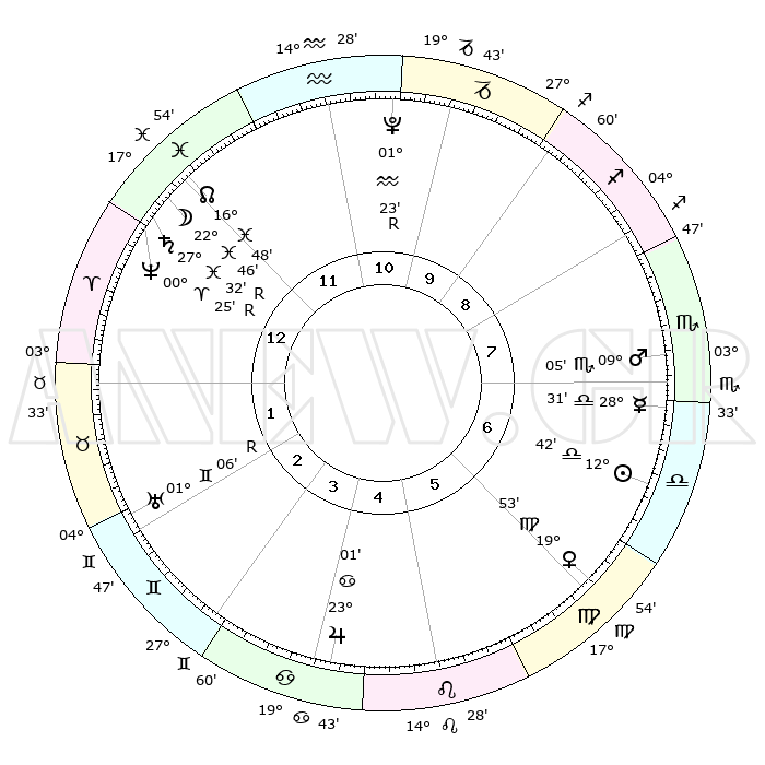 | ΘΕΣΕΙΣ ΠΛΑΝΗΤΩΝ ΑΣΤΡΟΛΟΓΙΚΟΥ ΧΑΡΤΗ ΤΗΣ ΣΤΙΓΜΗΣ ΑΥΤΗΣ | | Πλανήτης | Ζώδιο | Μοίρες | Δεκαήμ. | Σε οίκο | Απόκλιση | | Ακμές των οίκων | Ηλιος | Ζυγός | 12°36' | Δεύτερο | 7 | 04 S 59 | | 1ος | 07°05' | Ιχθείς | Σελήνη | Ιχθείς | 21°20' | Τρίτο | 1 | 03 S 11 | | 2ος | 21°46' | Κριός | Ερμής | Ζυγός | 28°22' | Τρίτο | 8 | 11 S 30 | | 3ος | 23°07' | Ταύρος | Αφροδίτη | Παρθένος | 19°45' | Δεύτερο | 7 | 05 N 20 | | 4ος | 16°52' | Δίδυμοι | Αρης | Σκορπιός | 09°01' | Πρώτο | 8 | 14 S 37 | | 5ος | 08°34' | Καρκίνος | Δίας | Καρκίνος | 23°00' | Τρίτο | 5 | 21 N 30 | | 6ος | 02°54' | Λέων | Κρόνος | Ιχθείς | 27°33'R | Τρίτο | 1 | 03 S 17 | | 7ος | 07°05' | Παρθένος | Ουρανός | Δίδυμοι | 01°06'R | Πρώτο | 3 | 20 N 10 | | 8ος | 21°46' | Ζυγός | Ποσειδώνας | Κριός | 00°25'R | Πρώτο | 1 | 01 S 06 | | 9ος | 23°07' | Σκορπιός | Πλούτωνας | Υδροχόος | 01°23'R | Πρώτο | 11 | 23 S 32 | | 10ος | 16°52' | Τοξότης | Β. Δεσμός | Ιχθείς | 16°48' | Δεύτερο | 1 | 05 S 13 | | 11ος | 08°34' | Αιγόκερως | Ωροσκόπος | Ιχθείς | 07°05' | Πρώτο | | | 12ος | 02°54' | Υδροχόος | Μεσουράνημα | Τοξότης | 16°52' | Δεύτερο | | | |