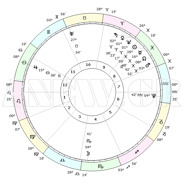 | | ΘΕΣΕΙΣ ΠΛΑΝΗΤΩΝ ΑΣΤΡΟΛΟΓΙΚΟΥ ΧΑΡΤΗ ΤΗΣ ΣΤΙΓΜΗΣ ΑΥΤΗΣ | | | | Πλανήτης | Ζώδιο | Μοίρες | Δεκαήμ. | Σε οίκο | Απόκλιση | | Ακμές των οίκων | | Ηλιος | Ιχθείς | 16°55' | Δεύτερο | 9 | 05 S 10 | | 1ος | 19°27' | Καρκίνος | | Σελήνη | Σκορπιός | 03°53' | Πρώτο | 4 | 16 S 52 | | 2ος | 09°59' | Λέων | | Ερμής | Ιχθείς | 16°51'R | Δεύτερο | 9 | 01 S 50 | | 3ος | 03°39' | Παρθένος | | Αφροδίτη | Κριός | 01°18' | Πρώτο | 9 | 00 S 37 | | 4ος | 03°11' | Ζυγός | | Αρης | Ιχθείς | 03°52' | Πρώτο | 9 | 11 S 07 | | 5ος | 09°09' | Σκορπιός | | Δίας | Καρκίνος | 15°06'R | Δεύτερο | 12 | 22 N 56 | | 6ος | 16°38' | Τοξότης | | Κρόνος | Κριός | 02°37' | Πρώτο | 9 | 00 S 55 | | 7ος | 19°27' | Αιγόκερως | | Ουρανός | Ταύρος | 27°53' | Τρίτο | 11 | 19 N 31 | | 8ος | 09°59' | Υδροχόος | | Ποσειδώνας | Κριός | 01°17' | Πρώτο | 9 | 00 S 41 | | 9ος | 03°39' | Ιχθείς | | Πλούτωνας | Υδροχόος | 04°42' | Πρώτο | 7 | 22 S 51 | | 10ος | 03°11' | Κριός | | Β. Δεσμός | Ιχθείς | 08°42' | Πρώτο | 9 | 08 S 18 | | 11ος | 09°09' | Ταύρος | | Ωροσκόπος | Καρκίνος | 19°27' | Δεύτερο | | | 12ος | 16°38' | Δίδυμοι | | Μεσουράνημα | Κριός | 03°11' | Πρώτο | | | |