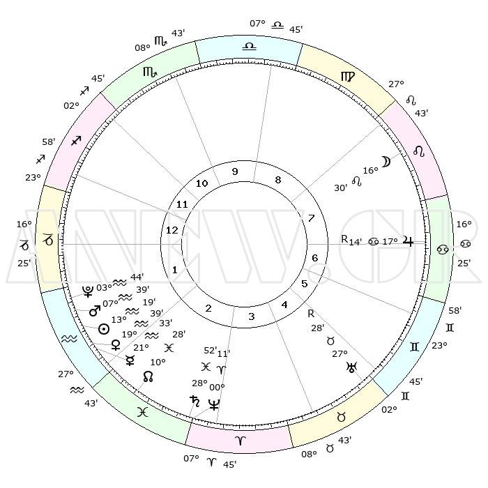 | | ΘΕΣΕΙΣ ΠΛΑΝΗΤΩΝ ΑΣΤΡΟΛΟΓΙΚΟΥ ΧΑΡΤΗ ΤΗΣ ΣΤΙΓΜΗΣ ΑΥΤΗΣ | | | | Πλανήτης | Ζώδιο | Μοίρες | Δεκαήμ. | Σε οίκο | Απόκλιση | | Ακμές των οίκων | | Ηλιος | Υδροχόος | 13°09' | Δεύτερο | 3 | 16 S 52 | | 1ος | 27°32' | Σκορπιός | | Σελήνη | Λέων | 14°21' | Δεύτερο | 9 | 18 N 37 | | 2ος | 28°21' | Τοξότης | | Ερμής | Υδροχόος | 21°17' | Τρίτο | 3 | 16 S 07 | | 3ος | 03°39' | Υδροχόος | | Αφροδίτη | Υδροχόος | 19°28' | Δεύτερο | 3 | 16 S 17 | | 4ος | 09°37' | Ιχθείς | | Αρης | Υδροχόος | 07°32' | Πρώτο | 3 | 19 S 24 | | 5ος | 10°57' | Κριός | | Δίας | Καρκίνος | 17°15'R | Δεύτερο | 8 | 22 N 38 | | 6ος | 06°20' | Ταύρος | | Κρόνος | Ιχθείς | 28°51' | Τρίτο | 4 | 02 S 27 | | 7ος | 27°32' | Ταύρος | | Ουρανός | Ταύρος | 27°28'R | Τρίτο | 6 | 19 N 24 | | 8ος | 28°21' | Δίδυμοι | | Ποσειδώνας | Κριός | 00°10' | Πρώτο | 4 | 01 S 08 | | 9ος | 03°39' | Λέων | | Πλούτωνας | Υδροχόος | 03°44' | Πρώτο | 3 | 23 S 01 | | 10ος | 09°37' | Παρθένος | | Β. Δεσμός | Ιχθείς | 10°28' | Δεύτερο | 4 | 07 S 38 | | 11ος | 10°57' | Ζυγός | | Ωροσκόπος | Σκορπιός | 27°32' | Τρίτο | | | 12ος | 06°20' | Σκορπιός | | Μεσουράνημα | Παρθένος | 09°37' | Πρώτο | | | |