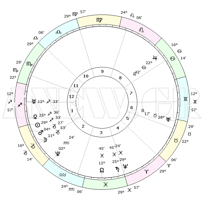 | | ΘΕΣΕΙΣ ΠΛΑΝΗΤΩΝ ΑΣΤΡΟΛΟΓΙΚΟΥ ΧΑΡΤΗ ΤΗΣ ΣΤΙΓΜΗΣ ΑΥΤΗΣ | | | | Πλανήτης | Ζώδιο | Μοίρες | Δεκαήμ. | Σε οίκο | Απόκλιση | | Ακμές των οίκων | | Ηλιος | Τοξότης | 29°29' | Τρίτο | 2 | 23 S 26 | | 1ος | 21°28' | Σκορπιός | | Σελήνη | Αιγόκερως | 10°59' | Δεύτερο | 2 | 27 S 20 | | 2ος | 21°34' | Τοξότης | | Ερμής | Τοξότης | 12°27' | Δεύτερο | 1 | 21 S 32 | | 3ος | 25°56' | Αιγόκερως | | Αφροδίτη | Τοξότης | 25°31' | Τρίτο | 2 | 23 S 26 | | 4ος | 01°38' | Ιχθείς | | Αρης | Αιγόκερως | 04°24' | Πρώτο | 2 | 24 S 11 | | 5ος | 03°34' | Κριός | | Δίας | Καρκίνος | 22°42'R | Τρίτο | 8 | 21 N 44 | | 6ος | 29°46' | Κριός | | Κρόνος | Ιχθείς | 25°45' | Τρίτο | 4 | 03 S 48 | | 7ος | 21°28' | Ταύρος | | Ουρανός | Ταύρος | 28°17'R | Τρίτο | 7 | 19 N 35 | | 8ος | 21°34' | Δίδυμοι | | Ποσειδώνας | Ιχθείς | 29°24' | Τρίτο | 4 | 01 S 28 | | 9ος | 25°56' | Καρκίνος | | Πλούτωνας | Υδροχόος | 02°24' | Πρώτο | 3 | 23 S 17 | | 10ος | 01°38' | Παρθένος | | Β. Δεσμός | Ιχθείς | 12°45' | Δεύτερο | 4 | 06 S 46 | | 11ος | 03°34' | Ζυγός | | Ωροσκόπος | Σκορπιός | 21°28' | Τρίτο | | | 12ος | 29°46' | Ζυγός | | Μεσουράνημα | Παρθένος | 01°38' | Πρώτο | | | |