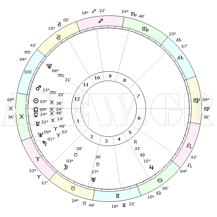 | | ΘΕΣΕΙΣ ΠΛΑΝΗΤΩΝ ΑΣΤΡΟΛΟΓΙΚΟΥ ΧΑΡΤΗ ΤΗΣ ΣΤΙΓΜΗΣ ΑΥΤΗΣ | | | | Πλανήτης | Ζώδιο | Μοίρες | Δεκαήμ. | Σε οίκο | Απόκλιση | | Ακμές των οίκων | | Ηλιος | Ιχθείς | 03°31' | Πρώτο | 1 | 10 S 13 | | 1ος | 00°49' | Υδροχόος | | Σελήνη | Ταύρος | 02°22' | Πρώτο | 3 | 16 N 17 | | 2ος | 15°03' | Ιχθείς | | Ερμής | Ιχθείς | 21°11' | Τρίτο | 2 | 01 S 51 | | 3ος | 23°22' | Κριός | | Αφροδίτη | Ιχθείς | 14°41' | Δεύτερο | 1 | 07 S 22 | | 4ος | 21°42' | Ταύρος | | Αρης | Υδροχόος | 23°21' | Τρίτο | 1 | 14 S 46 | | 5ος | 14°24' | Δίδυμοι | | Δίας | Καρκίνος | 15°33'R | Δεύτερο | 6 | 22 N 52 | | 6ος | 05°51' | Καρκίνος | | Κρόνος | Κριός | 01°02' | Πρώτο | 2 | 01 S 33 | | 7ος | 00°49' | Λέων | | Ουρανός | Ταύρος | 27°36' | Τρίτο | 4 | 19 N 27 | | 8ος | 15°03' | Παρθένος | | Ποσειδώνας | Κριός | 00°48' | Πρώτο | 2 | 00 S 53 | | 9ος | 23°22' | Ζυγός | | Πλούτωνας | Υδροχόος | 04°21' | Πρώτο | 1 | 22 S 54 | | 10ος | 21°42' | Σκορπιός | | Β. Δεσμός | Ιχθείς | 09°24' | Πρώτο | 1 | 08 S 02 | | 11ος | 14°24' | Τοξότης | | Ωροσκόπος | Υδροχόος | 00°49' | Πρώτο | | | 12ος | 05°51' | Αιγόκερως | | Μεσουράνημα | Σκορπιός | 21°42' | Τρίτο | | | |