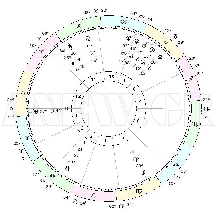 | | ΘΕΣΕΙΣ ΠΛΑΝΗΤΩΝ ΑΣΤΡΟΛΟΓΙΚΟΥ ΧΑΡΤΗ ΤΗΣ ΣΤΙΓΜΗΣ ΑΥΤΗΣ | | | | Πλανήτης | Ζώδιο | Μοίρες | Δεκαήμ. | Σε οίκο | Απόκλιση | | Ακμές των οίκων | | Ηλιος | Αιγόκερως | 17°00' | Δεύτερο | 11 | 22 S 21 | | 1ος | 16°08' | Υδροχόος | | Σελήνη | Παρθένος | 08°05' | Πρώτο | 7 | 08 N 43 | | 2ος | 01°53' | Κριός | | Ερμής | Αιγόκερως | 08°24' | Πρώτο | 11 | 24 S 22 | | 3ος | 07°22' | Ταύρος | | Αφροδίτη | Αιγόκερως | 17°09' | Δεύτερο | 11 | 23 S 04 | | 4ος | 03°22' | Δίδυμοι | | Αρης | Αιγόκερως | 17°33' | Δεύτερο | 11 | 23 S 12 | | 5ος | 25°18' | Δίδυμοι | | Δίας | Καρκίνος | 20°31'R | Τρίτο | 6 | 22 N 07 | | 6ος | 17°37' | Καρκίνος | | Κρόνος | Ιχθείς | 26°41' | Τρίτο | 1 | 03 S 22 | | 7ος | 16°08' | Λέων | | Ουρανός | Ταύρος | 27°47'R | Τρίτο | 3 | 19 N 28 | | 8ος | 01°53' | Ζυγός | | Ποσειδώνας | Ιχθείς | 29°36' | Τρίτο | 1 | 01 S 23 | | 9ος | 07°22' | Σκορπιός | | Πλούτωνας | Υδροχόος | 02°55' | Πρώτο | 12 | 23 S 11 | | 10ος | 03°22' | Τοξότης | | Β. Δεσμός | Ιχθείς | 11°50' | Δεύτερο | 1 | 07 S 07 | | 11ος | 25°18' | Τοξότης | | Ωροσκόπος | Υδροχόος | 16°08' | Δεύτερο | | | 12ος | 17°37' | Αιγόκερως | | Μεσουράνημα | Τοξότης | 03°22' | Πρώτο | | | |