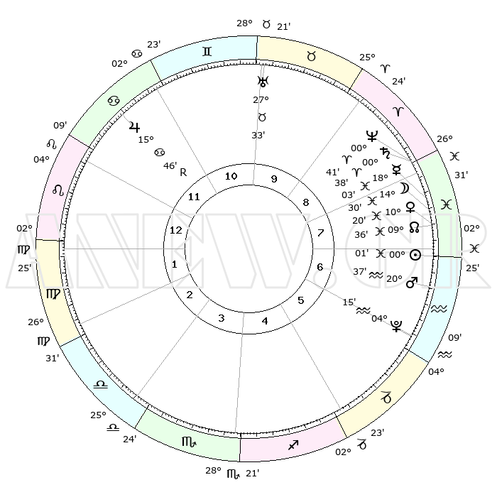 | | ΘΕΣΕΙΣ ΠΛΑΝΗΤΩΝ ΑΣΤΡΟΛΟΓΙΚΟΥ ΧΑΡΤΗ ΤΗΣ ΣΤΙΓΜΗΣ ΑΥΤΗΣ | | | | Πλανήτης | Ζώδιο | Μοίρες | Δεκαήμ. | Σε οίκο | Απόκλιση | | Ακμές των οίκων | | Ηλιος | Υδροχόος | 29°57' | Τρίτο | 7 | 11 S 29 | | 1ος | 10°40' | Λέων | | Σελήνη | Ιχθείς | 13°29' | Δεύτερο | 8 | 06 S 06 | | 2ος | 02°34' | Παρθένος | | Ερμής | Ιχθείς | 17°58' | Δεύτερο | 8 | 03 S 56 | | 3ος | 29°03' | Παρθένος | | Αφροδίτη | Ιχθείς | 10°14' | Δεύτερο | 8 | 09 S 05 | | 4ος | 01°10' | Σκορπιός | | Αρης | Υδροχόος | 20°34' | Τρίτο | 7 | 15 S 40 | | 5ος | 06°44' | Τοξότης | | Δίας | Καρκίνος | 15°46'R | Δεύτερο | 12 | 22 N 50 | | 6ος | 10°47' | Αιγόκερως | | Κρόνος | Κριός | 00°38' | Πρώτο | 9 | 01 S 43 | | 7ος | 10°40' | Υδροχόος | | Ουρανός | Ταύρος | 27°33' | Τρίτο | 10 | 19 N 26 | | 8ος | 02°34' | Ιχθείς | | Ποσειδώνας | Κριός | 00°41' | Πρώτο | 9 | 00 S 56 | | 9ος | 29°03' | Ιχθείς | | Πλούτωνας | Υδροχόος | 04°15' | Πρώτο | 6 | 22 S 55 | | 10ος | 01°10' | Ταύρος | | Β. Δεσμός | Ιχθείς | 09°36' | Πρώτο | 8 | 07 S 58 | | 11ος | 06°44' | Δίδυμοι | | Ωροσκόπος | Λέων | 10°40' | Δεύτερο | | | 12ος | 10°47' | Καρκίνος | | Μεσουράνημα | Ταύρος | 01°10' | Πρώτο | | | |