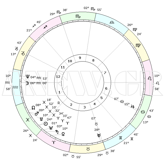 | | ΘΕΣΕΙΣ ΠΛΑΝΗΤΩΝ ΑΣΤΡΟΛΟΓΙΚΟΥ ΧΑΡΤΗ ΤΗΣ ΣΤΙΓΜΗΣ ΑΥΤΗΣ | | | | Πλανήτης | Ζώδιο | Μοίρες | Δεκαήμ. | Σε οίκο | Απόκλιση | | Ακμές των οίκων | | Ηλιος | Ιχθείς | 24°28' | Τρίτο | 2 | 02 S 12 | | 1ος | 15°57' | Αιγόκερως | | Σελήνη | Υδροχόος | 05°15' | Πρώτο | 1 | 21 S 47 | | 2ος | 27°09' | Υδροχόος | | Ερμής | Ιχθείς | 10°12'R | Δεύτερο | 2 | 05 S 31 | | 3ος | 07°12' | Κριός | | Αφροδίτη | Κριός | 10°42' | Δεύτερο | 3 | 03 N 16 | | 4ος | 08°15' | Ταύρος | | Αρης | Ιχθείς | 09°49' | Πρώτο | 2 | 08 S 53 | | 5ος | 02°21' | Δίδυμοι | | Δίας | Καρκίνος | 15°07' | Δεύτερο | 6 | 22 N 56 | | 6ος | 23°34' | Δίδυμοι | | Κρόνος | Κριός | 03°33' | Πρώτο | 2 | 00 S 32 | | 7ος | 15°57' | Καρκίνος | | Ουρανός | Ταύρος | 28°07' | Τρίτο | 4 | 19 N 34 | | 8ος | 27°09' | Λέων | | Ποσειδώνας | Κριός | 01°34' | Πρώτο | 2 | 00 S 35 | | 9ος | 07°12' | Ζυγός | | Πλούτωνας | Υδροχόος | 04°53' | Πρώτο | 1 | 22 S 49 | | 10ος | 08°15' | Σκορπιός | | Β. Δεσμός | Ιχθείς | 08°18' | Πρώτο | 2 | 08 S 27 | | 11ος | 02°21' | Τοξότης | | Ωροσκόπος | Αιγόκερως | 15°57' | Δεύτερο | | | 12ος | 23°34' | Τοξότης | | Μεσουράνημα | Σκορπιός | 08°15' | Πρώτο | | | |