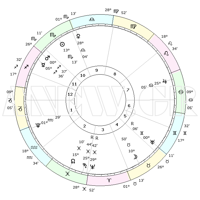 | | ΘΕΣΕΙΣ ΠΛΑΝΗΤΩΝ ΑΣΤΡΟΛΟΓΙΚΟΥ ΧΑΡΤΗ ΤΗΣ ΣΤΙΓΜΗΣ ΑΥΤΗΣ | | | | Πλανήτης | Ζώδιο | Μοίρες | Δεκαήμ. | Σε οίκο | Απόκλιση | | Ακμές των οίκων | | Ηλιος | Σκορπιός | 13°07' | Δεύτερο | 11 | 15 S 46 | | 1ος | 05°05' | Τοξότης | | Σελήνη | Ταύρος | 09°12' | Πρώτο | 5 | 18 N 22 | | 2ος | 06°59' | Αιγόκερως | | Ερμής | Τοξότης | 05°33' | Πρώτο | 1 | 23 S 59 | | 3ος | 13°32' | Υδροχόος | | Αφροδίτη | Ζυγός | 27°56' | Τρίτο | 11 | 09 S 25 | | 4ος | 19°38' | Ιχθείς | | Αρης | Τοξότης | 00°33' | Πρώτο | 12 | 20 S 41 | | 5ος | 19°59' | Κριός | | Δίας | Καρκίνος | 25°05' | Τρίτο | 8 | 21 N 12 | | 6ος | 14°21' | Ταύρος | | Κρόνος | Ιχθείς | 25°45'R | Τρίτο | 4 | 03 S 57 | | 7ος | 05°05' | Δίδυμοι | | Ουρανός | Δίδυμοι | 00°06'R | Πρώτο | 6 | 19 N 58 | | 8ος | 06°59' | Καρκίνος | | Ποσειδώνας | Ιχθείς | 29°42'R | Τρίτο | 4 | 01 S 22 | | 9ος | 13°32' | Λέων | | Πλούτωνας | Υδροχόος | 01°29' | Πρώτο | 2 | 23 S 30 | | 10ος | 19°38' | Παρθένος | | Β. Δεσμός | Ιχθείς | 15°10' | Δεύτερο | 3 | 05 S 50 | | 11ος | 19°59' | Ζυγός | | Ωροσκόπος | Τοξότης | 05°05' | Πρώτο | | | 12ος | 14°21' | Σκορπιός | | Μεσουράνημα | Παρθένος | 19°38' | Δεύτερο | | | |