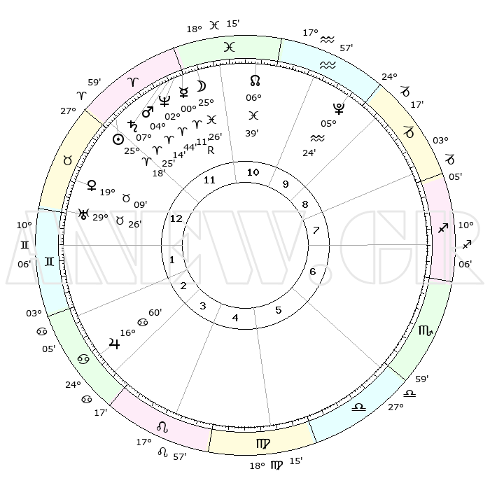 | | ΘΕΣΕΙΣ ΠΛΑΝΗΤΩΝ ΑΣΤΡΟΛΟΓΙΚΟΥ ΧΑΡΤΗ ΤΗΣ ΣΤΙΓΜΗΣ ΑΥΤΗΣ | | | | Πλανήτης | Ζώδιο | Μοίρες | Δεκαήμ. | Σε οίκο | Απόκλιση | | Ακμές των οίκων | | Ηλιος | Κριός | 25°15' | Τρίτο | 12 | 09 N 46 | | 1ος | 16°26' | Ταύρος | | Σελήνη | Ιχθείς | 24°40' | Τρίτο | 11 | 00 S 46 | | 2ος | 14°19' | Δίδυμοι | | Ερμής | Κριός | 00°06'R | Πρώτο | 11 | 02 S 21 | | 3ος | 06°27' | Καρκίνος | | Αφροδίτη | Ταύρος | 19°05' | Δεύτερο | 1 | 17 N 40 | | 4ος | 28°28' | Καρκίνος | | Αρης | Κριός | 04°12' | Πρώτο | 12 | 00 N 46 | | 5ος | 24°49' | Λέων | | Δίας | Καρκίνος | 16°59' | Δεύτερο | 3 | 22 N 44 | | 6ος | 00°49' | Ζυγός | | Κρόνος | Κριός | 07°25' | Πρώτο | 12 | 00 N 58 | | 7ος | 16°26' | Σκορπιός | | Ουρανός | Ταύρος | 29°26' | Τρίτο | 1 | 19 N 52 | | 8ος | 14°19' | Τοξότης | | Ποσειδώνας | Κριός | 02°44' | Πρώτο | 12 | 00 S 07 | | 9ος | 06°27' | Αιγόκερως | | Πλούτωνας | Υδροχόος | 05°24' | Πρώτο | 10 | 22 S 47 | | 10ος | 28°28' | Αιγόκερως | | Β. Δεσμός | Ιχθείς | 06°39' | Πρώτο | 11 | 09 S 04 | | 11ος | 24°49' | Υδροχόος | | Ωροσκόπος | Ταύρος | 16°26' | Δεύτερο | | | 12ος | 00°49' | Κριός | | Μεσουράνημα | Αιγόκερως | 28°28' | Τρίτο | | | |