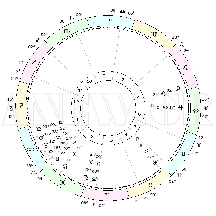 | | ΘΕΣΕΙΣ ΠΛΑΝΗΤΩΝ ΑΣΤΡΟΛΟΓΙΚΟΥ ΧΑΡΤΗ ΤΗΣ ΣΤΙΓΜΗΣ ΑΥΤΗΣ | | | | Πλανήτης | Ζώδιο | Μοίρες | Δεκαήμ. | Σε οίκο | Απόκλιση | | Ακμές των οίκων | | Ηλιος | Υδροχόος | 12°01' | Δεύτερο | 4 | 17 S 11 | | 1ος | 22°52' | Ζυγός | | Σελήνη | Καρκίνος | 28°27' | Τρίτο | 10 | 23 N 48 | | 2ος | 20°52' | Σκορπιός | | Ερμής | Υδροχόος | 19°18' | Δεύτερο | 4 | 16 S 49 | | 3ος | 22°20' | Τοξότης | | Αφροδίτη | Υδροχόος | 18°04' | Δεύτερο | 4 | 16 S 42 | | 4ος | 26°05' | Αιγόκερως | | Αρης | Υδροχόος | 06°39' | Πρώτο | 4 | 19 S 37 | | 5ος | 29°02' | Υδροχόος | | Δίας | Καρκίνος | 17°22'R | Δεύτερο | 9 | 22 N 36 | | 6ος | 28°17' | Ιχθείς | | Κρόνος | Ιχθείς | 28°45' | Τρίτο | 6 | 02 S 30 | | 7ος | 22°52' | Κριός | | Ουρανός | Ταύρος | 27°28'R | Τρίτο | 8 | 19 N 24 | | 8ος | 20°52' | Ταύρος | | Ποσειδώνας | Κριός | 00°08' | Πρώτο | 6 | 01 S 09 | | 9ος | 22°20' | Δίδυμοι | | Πλούτωνας | Υδροχόος | 03°42' | Πρώτο | 4 | 23 S 01 | | 10ος | 26°05' | Καρκίνος | | Β. Δεσμός | Ιχθείς | 10°32' | Δεύτερο | 5 | 07 S 37 | | 11ος | 29°02' | Λέων | | Ωροσκόπος | Ζυγός | 22°52' | Τρίτο | | | 12ος | 28°17' | Παρθένος | | Μεσουράνημα | Καρκίνος | 26°05' | Τρίτο | | | |