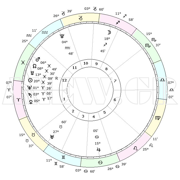 | | ΘΕΣΕΙΣ ΠΛΑΝΗΤΩΝ ΑΣΤΡΟΛΟΓΙΚΟΥ ΧΑΡΤΗ ΤΗΣ ΣΤΙΓΜΗΣ ΑΥΤΗΣ | | | | Πλανήτης | Ζώδιο | Μοίρες | Δεκαήμ. | Σε οίκο | Απόκλιση | | Ακμές των οίκων | | Ηλιος | Ιχθείς | 20°36' | Τρίτο | 1 | 03 S 43 | | 1ος | 07°12' | Ιχθείς | | Σελήνη | Τοξότης | 18°08' | Δεύτερο | 10 | 28 S 05 | | 2ος | 21°52' | Κριός | | Ερμής | Ιχθείς | 13°12'R | Δεύτερο | 1 | 03 S 38 | | 3ος | 23°11' | Ταύρος | | Αφροδίτη | Κριός | 05°53' | Πρώτο | 1 | 01 N 17 | | 4ος | 16°56' | Δίδυμοι | | Αρης | Ιχθείς | 06°46' | Πρώτο | 12 | 10 S 02 | | 5ος | 08°38' | Καρκίνος | | Δίας | Καρκίνος | 15°05'R | Δεύτερο | 5 | 22 N 56 | | 6ος | 02°59' | Λέων | | Κρόνος | Κριός | 03°04' | Πρώτο | 1 | 00 S 44 | | 7ος | 07°12' | Παρθένος | | Ουρανός | Ταύρος | 27°60' | Τρίτο | 3 | 19 N 32 | | 8ος | 21°52' | Ζυγός | | Ποσειδώνας | Κριός | 01°25' | Πρώτο | 1 | 00 S 38 | | 9ος | 23°11' | Σκορπιός | | Πλούτωνας | Υδροχόος | 04°48' | Πρώτο | 12 | 22 S 50 | | 10ος | 16°56' | Τοξότης | | Β. Δεσμός | Ιχθείς | 08°30' | Πρώτο | 1 | 08 S 23 | | 11ος | 08°38' | Αιγόκερως | | Ωροσκόπος | Ιχθείς | 07°12' | Πρώτο | | | 12ος | 02°59' | Υδροχόος | | Μεσουράνημα | Τοξότης | 16°56' | Δεύτερο | | | |