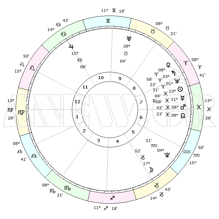| | ΘΕΣΕΙΣ ΠΛΑΝΗΤΩΝ ΑΣΤΡΟΛΟΓΙΚΟΥ ΧΑΡΤΗ ΤΗΣ ΣΤΙΓΜΗΣ ΑΥΤΗΣ | | | | Πλανήτης | Ζώδιο | Μοίρες | Δεκαήμ. | Σε οίκο | Απόκλιση | | Ακμές των οίκων | | Ηλιος | Ιχθείς | 23°01' | Τρίτο | 8 | 02 S 46 | | 1ος | 26°39' | Λέων | | Σελήνη | Αιγόκερως | 17°10' | Δεύτερο | 5 | 26 S 27 | | 2ος | 20°09' | Παρθένος | | Ερμής | Ιχθείς | 11°11'R | Δεύτερο | 7 | 04 S 51 | | 3ος | 18°30' | Ζυγός | | Αφροδίτη | Κριός | 08°54' | Πρώτο | 8 | 02 N 32 | | 4ος | 21°22' | Σκορπιός | | Αρης | Ιχθείς | 08°41' | Πρώτο | 7 | 09 S 19 | | 5ος | 25°47' | Τοξότης | | Δίας | Καρκίνος | 15°06' | Δεύτερο | 11 | 22 N 56 | | 6ος | 28°01' | Αιγόκερως | | Κρόνος | Κριός | 03°22' | Πρώτο | 8 | 00 S 37 | | 7ος | 26°39' | Υδροχόος | | Ουρανός | Ταύρος | 28°04' | Τρίτο | 10 | 19 N 33 | | 8ος | 20°09' | Ιχθείς | | Ποσειδώνας | Κριός | 01°31' | Πρώτο | 8 | 00 S 36 | | 9ος | 18°30' | Κριός | | Πλούτωνας | Υδροχόος | 04°51' | Πρώτο | 6 | 22 S 50 | | 10ος | 21°22' | Ταύρος | | Β. Δεσμός | Ιχθείς | 08°23' | Πρώτο | 7 | 08 S 26 | | 11ος | 25°47' | Δίδυμοι | | Ωροσκόπος | Λέων | 26°39' | Τρίτο | | | 12ος | 28°02' | Καρκίνος | | Μεσουράνημα | Ταύρος | 21°22' | Τρίτο | | | |