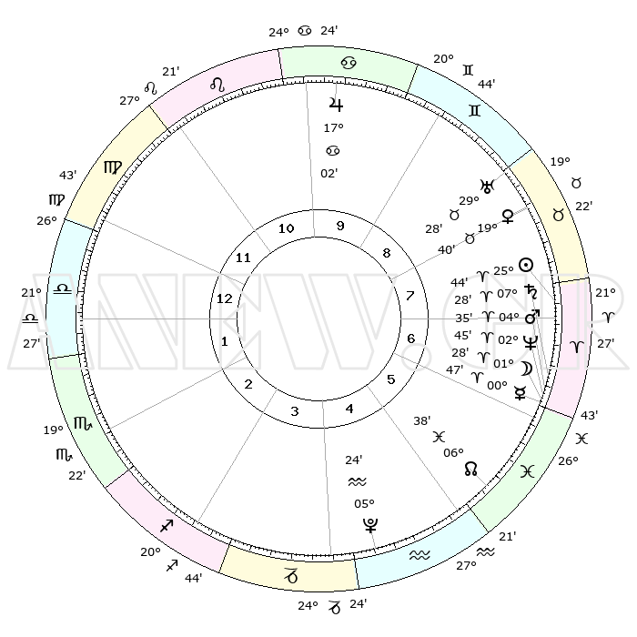 | | ΘΕΣΕΙΣ ΠΛΑΝΗΤΩΝ ΑΣΤΡΟΛΟΓΙΚΟΥ ΧΑΡΤΗ ΤΗΣ ΣΤΙΓΜΗΣ ΑΥΤΗΣ | | | | Πλανήτης | Ζώδιο | Μοίρες | Δεκαήμ. | Σε οίκο | Απόκλιση | | Ακμές των οίκων | | Ηλιος | Κριός | 25°40' | Τρίτο | 7 | 09 N 55 | | 1ος | 01°38' | Ζυγός | | Σελήνη | Κριός | 00°31' | Πρώτο | 6 | 02 N 01 | | 2ος | 28°20' | Ζυγός | | Ερμής | Κριός | 00°42' | Πρώτο | 6 | 02 S 07 | | 3ος | 28°50' | Σκορπιός | | Αφροδίτη | Ταύρος | 19°35' | Δεύτερο | 8 | 17 N 49 | | 4ος | 01°50' | Αιγόκερως | | Αρης | Κριός | 04°31' | Πρώτο | 7 | 00 N 54 | | 5ος | 04°47' | Υδροχόος | | Δίας | Καρκίνος | 17°02' | Δεύτερο | 10 | 22 N 44 | | 6ος | 05°10' | Ιχθείς | | Κρόνος | Κριός | 07°28' | Πρώτο | 7 | 00 N 59 | | 7ος | 01°38' | Κριός | | Ουρανός | Ταύρος | 29°27' | Τρίτο | 9 | 19 N 52 | | 8ος | 28°20' | Κριός | | Ποσειδώνας | Κριός | 02°45' | Πρώτο | 7 | 00 S 07 | | 9ος | 28°50' | Ταύρος | | Πλούτωνας | Υδροχόος | 05°24' | Πρώτο | 5 | 22 S 47 | | 10ος | 01°50' | Καρκίνος | | Β. Δεσμός | Ιχθείς | 06°38' | Πρώτο | 6 | 09 S 05 | | 11ος | 04°47' | Λέων | | Ωροσκόπος | Ζυγός | 01°38' | Πρώτο | | | 12ος | 05°10' | Παρθένος | | Μεσουράνημα | Καρκίνος | 01°50' | Πρώτο | | | |