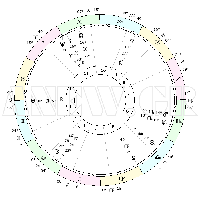| ΘΕΣΕΙΣ ΠΛΑΝΗΤΩΝ ΑΣΤΡΟΛΟΓΙΚΟΥ ΧΑΡΤΗ ΤΗΣ ΣΤΙΓΜΗΣ ΑΥΤΗΣ | | Πλανήτης | Ζώδιο | Μοίρες | Δεκαήμ. | Σε οίκο | Απόκλιση | | Ακμές των οίκων | Ηλιος | Ζυγός | 20°32' | Τρίτο | 7 | 08 S 01 | | 1ος | 02°41' | Κριός | Σελήνη | Καρκίνος | 18°52' | Δεύτερο | 4 | 26 N 32 | | 2ος | 12°19' | Ταύρος | Ερμής | Σκορπιός | 10°09' | Δεύτερο | 7 | 16 S 21 | | 3ος | 09°19' | Δίδυμοι | Αφροδίτη | Παρθένος | 29°41' | Τρίτο | 6 | 01 N 30 | | 4ος | 01°30' | Καρκίνος | Αρης | Σκορπιός | 14°33' | Δεύτερο | 8 | 16 S 24 | | 5ος | 23°56' | Καρκίνος | Δίας | Καρκίνος | 23°48' | Τρίτο | 4 | 21 N 23 | | 6ος | 21°45' | Λέων | Κρόνος | Ιχθείς | 26°59'R | Τρίτο | 12 | 03 S 30 | | 7ος | 02°41' | Ζυγός | Ουρανός | Δίδυμοι | 00°54'R | Πρώτο | 2 | 20 N 08 | | 8ος | 12°19' | Σκορπιός | Ποσειδώνας | Κριός | 00°13'R | Πρώτο | 12 | 01 S 11 | | 9ος | 09°19' | Τοξότης | Πλούτωνας | Υδροχόος | 01°22'R | Πρώτο | 11 | 23 S 32 | | 10ος | 01°30' | Αιγόκερως | Β. Δεσμός | Ιχθείς | 16°22' | Δεύτερο | 12 | 05 S 23 | | 11ος | 23°56' | Αιγόκερως | Ωροσκόπος | Κριός | 02°41' | Πρώτο | | | 12ος | 21°45' | Υδροχόος | Μεσουράνημα | Αιγόκερως | 01°30' | Πρώτο | | | |