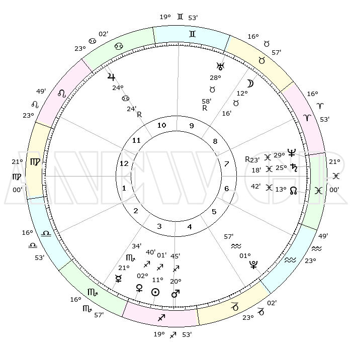 | | ΘΕΣΕΙΣ ΠΛΑΝΗΤΩΝ ΑΣΤΡΟΛΟΓΙΚΟΥ ΧΑΡΤΗ ΤΗΣ ΣΤΙΓΜΗΣ ΑΥΤΗΣ | | | | Πλανήτης | Ζώδιο | Μοίρες | Δεκαήμ. | Σε οίκο | Απόκλιση | | Ακμές των οίκων | | Ηλιος | Τοξότης | 10°60' | Δεύτερο | 3 | 22 S 05 | | 1ος | 13°15' | Παρθένος | | Σελήνη | Ταύρος | 11°53' | Δεύτερο | 9 | 19 N 26 | | 2ος | 08°26' | Ζυγός | | Ερμής | Σκορπιός | 21°33' | Τρίτο | 3 | 15 S 37 | | 3ος | 08°05' | Σκορπιός | | Αφροδίτη | Τοξότης | 02°38' | Πρώτο | 3 | 20 S 04 | | 4ος | 11°02' | Τοξότης | | Αρης | Τοξότης | 20°44' | Τρίτο | 4 | 23 S 47 | | 5ος | 14°28' | Αιγόκερως | | Δίας | Καρκίνος | 24°24'R | Τρίτο | 11 | 21 N 24 | | 6ος | 15°36' | Υδροχόος | | Κρόνος | Ιχθείς | 25°18' | Τρίτο | 7 | 04 S 02 | | 7ος | 13°15' | Ιχθείς | | Ουρανός | Ταύρος | 28°58'R | Τρίτο | 9 | 19 N 43 | | 8ος | 08°26' | Κριός | | Ποσειδώνας | Ιχθείς | 29°23'R | Τρίτο | 7 | 01 S 29 | | 9ος | 08°05' | Ταύρος | | Πλούτωνας | Υδροχόος | 01°57' | Πρώτο | 5 | 23 S 23 | | 10ος | 11°02' | Δίδυμοι | | Β. Δεσμός | Ιχθείς | 13°43' | Δεύτερο | 7 | 06 S 24 | | 11ος | 14°28' | Καρκίνος | | Ωροσκόπος | Παρθένος | 13°15' | Δεύτερο | | | 12ος | 15°36' | Λέων | | Μεσουράνημα | Δίδυμοι | 11°02' | Δεύτερο | | | |