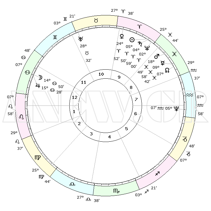 | | ΘΕΣΕΙΣ ΠΛΑΝΗΤΩΝ ΑΣΤΡΟΛΟΓΙΚΟΥ ΧΑΡΤΗ ΤΗΣ ΣΤΙΓΜΗΣ ΑΥΤΗΣ | | | | Πλανήτης | Ζώδιο | Μοίρες | Δεκαήμ. | Σε οίκο | Απόκλιση | | Ακμές των οίκων | | Ηλιος | Κριός | 05°46' | Πρώτο | 10 | 02 N 18 | | 1ος | 17°43' | Καρκίνος | | Σελήνη | Καρκίνος | 13°52' | Δεύτερο | 12 | 26 N 58 | | 2ος | 08°12' | Λέων | | Ερμής | Ιχθείς | 09°56' | Πρώτο | 9 | 08 S 07 | | 3ος | 01°40' | Παρθένος | | Αφροδίτη | Κριός | 24°47' | Τρίτο | 10 | 08 N 59 | | 4ος | 00°55' | Ζυγός | | Αρης | Ιχθείς | 18°46' | Δεύτερο | 9 | 05 S 25 | | 5ος | 06°48' | Σκορπιός | | Δίας | Καρκίνος | 15°28' | Δεύτερο | 12 | 22 N 54 | | 6ος | 14°34' | Τοξότης | | Κρόνος | Κριός | 04°58' | Πρώτο | 10 | 00 N 01 | | 7ος | 17°43' | Αιγόκερως | | Ουρανός | Ταύρος | 28°32' | Τρίτο | 11 | 19 N 40 | | 8ος | 08°12' | Υδροχόος | | Ποσειδώνας | Κριός | 01°60' | Πρώτο | 10 | 00 S 24 | | 9ος | 01°40' | Ιχθείς | | Πλούτωνας | Υδροχόος | 05°07' | Πρώτο | 7 | 22 S 48 | | 10ος | 00°55' | Κριός | | Β. Δεσμός | Ιχθείς | 07°42' | Πρώτο | 9 | 08 S 41 | | 11ος | 06°48' | Ταύρος | | Ωροσκόπος | Καρκίνος | 17°43' | Δεύτερο | | | 12ος | 14°34' | Δίδυμοι | | Μεσουράνημα | Κριός | 00°55' | Πρώτο | | | |