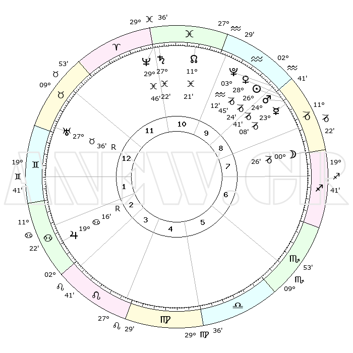 | | ΘΕΣΕΙΣ ΠΛΑΝΗΤΩΝ ΑΣΤΡΟΛΟΓΙΚΟΥ ΧΑΡΤΗ ΤΗΣ ΣΤΙΓΜΗΣ ΑΥΤΗΣ | | | | Πλανήτης | Ζώδιο | Μοίρες | Δεκαήμ. | Σε οίκο | Απόκλιση | | Ακμές των οίκων | | Ηλιος | Αιγόκερως | 25°50' | Τρίτο | 3 | 20 S 58 | | 1ος | 05°38' | Σκορπιός | | Σελήνη | Τοξότης | 23°54' | Τρίτο | 2 | 28 S 16 | | 2ος | 04°24' | Τοξότης | | Ερμής | Αιγόκερως | 22°15' | Τρίτο | 3 | 23 S 25 | | 3ος | 06°51' | Αιγόκερως | | Αφροδίτη | Αιγόκερως | 28°04' | Τρίτο | 3 | 21 S 32 | | 4ος | 11°26' | Υδροχόος | | Αρης | Αιγόκερως | 24°15' | Τρίτο | 3 | 22 S 13 | | 5ος | 14°15' | Ιχθείς | | Δίας | Καρκίνος | 19°21'R | Δεύτερο | 9 | 22 N 18 | | 6ος | 12°22' | Κριός | | Κρόνος | Ιχθείς | 27°19' | Τρίτο | 5 | 03 S 06 | | 7ος | 05°38' | Ταύρος | | Ουρανός | Ταύρος | 27°37'R | Τρίτο | 7 | 19 N 26 | | 8ος | 04°24' | Δίδυμοι | | Ποσειδώνας | Ιχθείς | 29°45' | Τρίτο | 5 | 01 S 19 | | 9ος | 06°51' | Καρκίνος | | Πλούτωνας | Υδροχόος | 03°11' | Πρώτο | 3 | 23 S 07 | | 10ος | 11°26' | Λέων | | Β. Δεσμός | Ιχθείς | 11°23' | Δεύτερο | 4 | 07 S 18 | | 11ος | 14°15' | Παρθένος | | Ωροσκόπος | Σκορπιός | 05°38' | Πρώτο | | | 12ος | 12°22' | Ζυγός | | Μεσουράνημα | Λέων | 11°26' | Δεύτερο | | | |