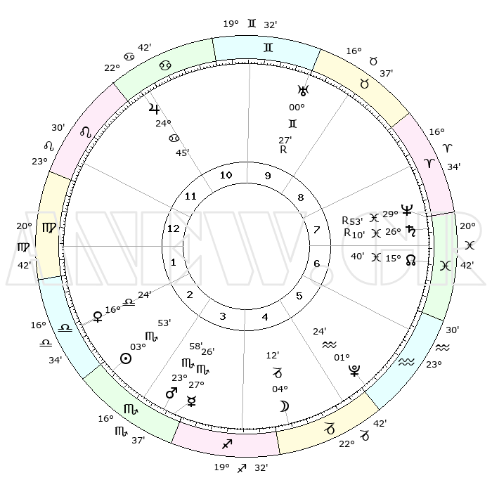 | | ΘΕΣΕΙΣ ΠΛΑΝΗΤΩΝ ΑΣΤΡΟΛΟΓΙΚΟΥ ΧΑΡΤΗ ΤΗΣ ΣΤΙΓΜΗΣ ΑΥΤΗΣ | | | | Πλανήτης | Ζώδιο | Μοίρες | Δεκαήμ. | Σε οίκο | Απόκλιση | | Ακμές των οίκων | | Ηλιος | Σκορπιός | 03°47' | Πρώτο | 3 | 12 S 47 | | 1ος | 23°42' | Λέων | | Σελήνη | Αιγόκερως | 03°05' | Πρώτο | 5 | 28 S 20 | | 2ος | 16°54' | Παρθένος | | Ερμής | Σκορπιός | 27°20' | Τρίτο | 4 | 22 S 14 | | 3ος | 14°57' | Ζυγός | | Αφροδίτη | Ζυγός | 16°17' | Δεύτερο | 3 | 05 S 00 | | 4ος | 17°45' | Σκορπιός | | Αρης | Σκορπιός | 23°54' | Τρίτο | 4 | 19 S 05 | | 5ος | 22°23' | Τοξότης | | Δίας | Καρκίνος | 24°45' | Τρίτο | 11 | 21 N 15 | | 6ος | 24°53' | Αιγόκερως | | Κρόνος | Ιχθείς | 26°10'R | Τρίτο | 8 | 03 S 48 | | 7ος | 23°42' | Υδροχόος | | Ουρανός | Δίδυμοι | 00°28'R | Πρώτο | 10 | 20 N 02 | | 8ος | 16°54' | Ιχθείς | | Ποσειδώνας | Ιχθείς | 29°54'R | Τρίτο | 8 | 01 S 18 | | 9ος | 14°57' | Κριός | | Πλούτωνας | Υδροχόος | 01°24' | Πρώτο | 6 | 23 S 31 | | 10ος | 17°45' | Ταύρος | | Β. Δεσμός | Ιχθείς | 15°40' | Δεύτερο | 7 | 05 S 39 | | 11ος | 22°23' | Δίδυμοι | | Ωροσκόπος | Λέων | 23°42' | Τρίτο | | | 12ος | 24°53' | Καρκίνος | | Μεσουράνημα | Ταύρος | 17°45' | Δεύτερο | | | |