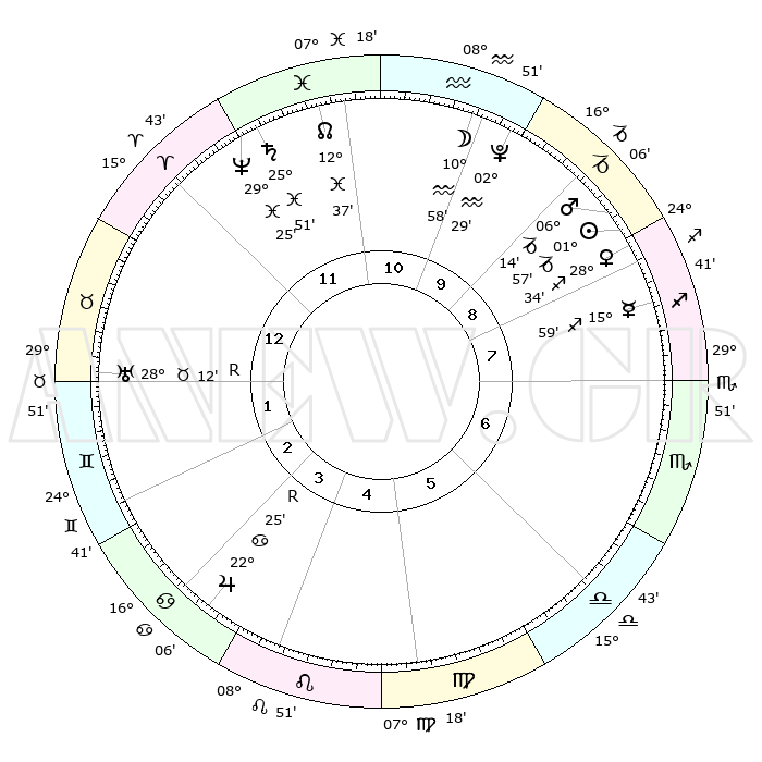 | | ΘΕΣΕΙΣ ΠΛΑΝΗΤΩΝ ΑΣΤΡΟΛΟΓΙΚΟΥ ΧΑΡΤΗ ΤΗΣ ΣΤΙΓΜΗΣ ΑΥΤΗΣ | | | | Πλανήτης | Ζώδιο | Μοίρες | Δεκαήμ. | Σε οίκο | Απόκλιση | | Ακμές των οίκων | | Ηλιος | Αιγόκερως | 01°52' | Πρώτο | 9 | 23 S 25 | | 1ος | 16°31' | Κριός | | Σελήνη | Υδροχόος | 09°53' | Πρώτο | 11 | 20 S 18 | | 2ος | 22°29' | Ταύρος | | Ερμής | Τοξότης | 15°52' | Δεύτερο | 8 | 22 S 14 | | 3ος | 17°35' | Δίδυμοι | | Αφροδίτη | Τοξότης | 28°28' | Τρίτο | 9 | 23 S 36 | | 4ος | 09°23' | Καρκίνος | | Αρης | Αιγόκερως | 06°11' | Πρώτο | 9 | 24 S 07 | | 5ος | 02°38' | Λέων | | Δίας | Καρκίνος | 22°26'R | Τρίτο | 4 | 21 N 47 | | 6ος | 02°47' | Παρθένος | | Κρόνος | Ιχθείς | 25°51' | Τρίτο | 12 | 03 S 45 | | 7ος | 16°31' | Ζυγός | | Ουρανός | Ταύρος | 28°12'R | Τρίτο | 2 | 19 N 34 | | 8ος | 22°29' | Σκορπιός | | Ποσειδώνας | Ιχθείς | 29°25' | Τρίτο | 12 | 01 S 27 | | 9ος | 17°35' | Τοξότης | | Πλούτωνας | Υδροχόος | 02°28' | Πρώτο | 10 | 23 S 16 | | 10ος | 09°23' | Αιγόκερως | | Β. Δεσμός | Ιχθείς | 12°37' | Δεύτερο | 12 | 06 S 49 | | 11ος | 02°38' | Υδροχόος | | Ωροσκόπος | Κριός | 16°31' | Δεύτερο | | | 12ος | 02°47' | Ιχθείς | | Μεσουράνημα | Αιγόκερως | 09°23' | Πρώτο | | | |