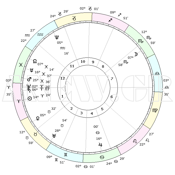 | | ΘΕΣΕΙΣ ΠΛΑΝΗΤΩΝ ΑΣΤΡΟΛΟΓΙΚΟΥ ΧΑΡΤΗ ΤΗΣ ΣΤΙΓΜΗΣ ΑΥΤΗΣ | | | | Πλανήτης | Ζώδιο | Μοίρες | Δεκαήμ. | Σε οίκο | Απόκλιση | | Ακμές των οίκων | | Ηλιος | Κριός | 14°20' | Δεύτερο | 2 | 05 N 39 | | 1ος | 25°40' | Υδροχόος | | Σελήνη | Σκορπιός | 07°09' | Πρώτο | 8 | 18 S 04 | | 2ος | 11°21' | Κριός | | Ερμής | Ιχθείς | 16°33' | Δεύτερο | 1 | 06 S 55 | | 3ος | 14°56' | Ταύρος | | Αφροδίτη | Ταύρος | 05°27' | Πρώτο | 2 | 13 N 02 | | 4ος | 09°47' | Δίδυμοι | | Αρης | Ιχθείς | 25°33' | Τρίτο | 1 | 02 S 43 | | 5ος | 01°30' | Καρκίνος | | Δίας | Καρκίνος | 15°60' | Δεύτερο | 5 | 22 N 51 | | 6ος | 24°38' | Καρκίνος | | Κρόνος | Κριός | 06°03' | Πρώτο | 1 | 00 N 27 | | 7ος | 25°40' | Λέων | | Ουρανός | Ταύρος | 28°54' | Τρίτο | 3 | 19 N 45 | | 8ος | 11°21' | Ζυγός | | Ποσειδώνας | Κριός | 02°20' | Πρώτο | 1 | 00 S 17 | | 9ος | 14°56' | Σκορπιός | | Πλούτωνας | Υδροχόος | 05°16' | Πρώτο | 12 | 22 S 47 | | 10ος | 09°47' | Τοξότης | | Β. Δεσμός | Ιχθείς | 07°14' | Πρώτο | 1 | 08 S 51 | | 11ος | 01°30' | Αιγόκερως | | Ωροσκόπος | Υδροχόος | 25°40' | Τρίτο | | | 12ος | 24°38' | Αιγόκερως | | Μεσουράνημα | Τοξότης | 09°47' | Πρώτο | | | |