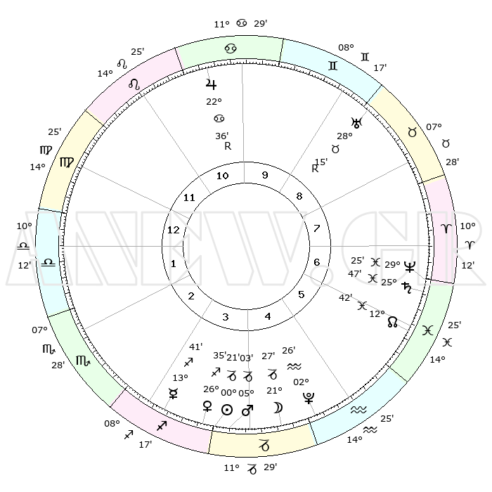 | | ΘΕΣΕΙΣ ΠΛΑΝΗΤΩΝ ΑΣΤΡΟΛΟΓΙΚΟΥ ΧΑΡΤΗ ΤΗΣ ΣΤΙΓΜΗΣ ΑΥΤΗΣ | | | | Πλανήτης | Ζώδιο | Μοίρες | Δεκαήμ. | Σε οίκο | Απόκλιση | | Ακμές των οίκων | | Ηλιος | Αιγόκερως | 00°16' | Πρώτο | 4 | 23 S 26 | | 1ος | 17°53' | Παρθένος | | Σελήνη | Αιγόκερως | 20°31' | Τρίτο | 5 | 25 S 44 | | 2ος | 13°30' | Ζυγός | | Ερμής | Τοξότης | 13°35' | Δεύτερο | 3 | 21 S 47 | | 3ος | 13°24' | Σκορπιός | | Αφροδίτη | Τοξότης | 26°30' | Τρίτο | 4 | 23 S 30 | | 4ος | 16°20' | Τοξότης | | Αρης | Αιγόκερως | 04°59' | Πρώτο | 4 | 24 S 10 | | 5ος | 19°35' | Αιγόκερως | | Δίας | Καρκίνος | 22°37'R | Τρίτο | 11 | 21 N 45 | | 6ος | 20°30' | Υδροχόος | | Κρόνος | Ιχθείς | 25°47' | Τρίτο | 7 | 03 S 47 | | 7ος | 17°53' | Ιχθείς | | Ουρανός | Ταύρος | 28°15'R | Τρίτο | 9 | 19 N 34 | | 8ος | 13°30' | Κριός | | Ποσειδώνας | Ιχθείς | 29°25' | Τρίτο | 7 | 01 S 28 | | 9ος | 13°24' | Ταύρος | | Πλούτωνας | Υδροχόος | 02°26' | Πρώτο | 5 | 23 S 17 | | 10ος | 16°20' | Δίδυμοι | | Β. Δεσμός | Ιχθείς | 12°42' | Δεύτερο | 6 | 06 S 47 | | 11ος | 19°35' | Καρκίνος | | Ωροσκόπος | Παρθένος | 17°53' | Δεύτερο | | | 12ος | 20°30' | Λέων | | Μεσουράνημα | Δίδυμοι | 16°20' | Δεύτερο | | | |