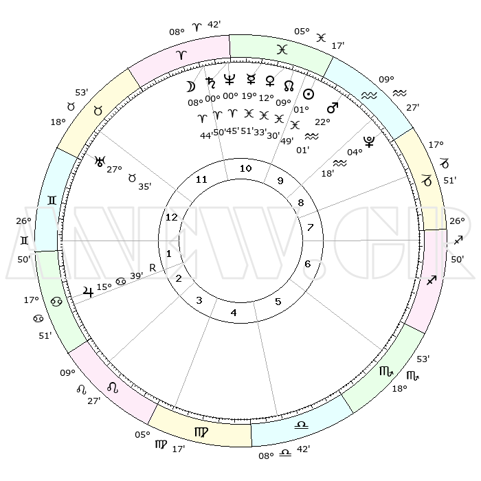 | | ΘΕΣΕΙΣ ΠΛΑΝΗΤΩΝ ΑΣΤΡΟΛΟΓΙΚΟΥ ΧΑΡΤΗ ΤΗΣ ΣΤΙΓΜΗΣ ΑΥΤΗΣ | | | | Πλανήτης | Ζώδιο | Μοίρες | Δεκαήμ. | Σε οίκο | Απόκλιση | | Ακμές των οίκων | | Ηλιος | Ιχθείς | 01°44' | Πρώτο | 11 | 10 S 51 | | 1ος | 23°45' | Ταύρος | | Σελήνη | Κριός | 07°33' | Πρώτο | 11 | 05 N 19 | | 2ος | 19°54' | Δίδυμοι | | Ερμής | Ιχθείς | 19°47' | Δεύτερο | 11 | 02 S 49 | | 3ος | 11°35' | Καρκίνος | | Αφροδίτη | Ιχθείς | 12°27' | Δεύτερο | 11 | 08 S 14 | | 4ος | 03°57' | Λέων | | Αρης | Υδροχόος | 21°57' | Τρίτο | 10 | 15 S 13 | | 5ος | 01°23' | Παρθένος | | Δίας | Καρκίνος | 15°39'R | Δεύτερο | 3 | 22 N 51 | | 6ος | 08°46' | Ζυγός | | Κρόνος | Κριός | 00°50' | Πρώτο | 11 | 01 S 38 | | 7ος | 23°45' | Σκορπιός | | Ουρανός | Ταύρος | 27°35' | Τρίτο | 1 | 19 N 26 | | 8ος | 19°54' | Τοξότης | | Ποσειδώνας | Κριός | 00°45' | Πρώτο | 11 | 00 S 54 | | 9ος | 11°35' | Αιγόκερως | | Πλούτωνας | Υδροχόος | 04°18' | Πρώτο | 10 | 22 S 55 | | 10ος | 03°57' | Υδροχόος | | Β. Δεσμός | Ιχθείς | 09°30' | Πρώτο | 11 | 08 S 00 | | 11ος | 01°23' | Ιχθείς | | Ωροσκόπος | Ταύρος | 23°45' | Τρίτο | | | 12ος | 08°46' | Κριός | | Μεσουράνημα | Υδροχόος | 03°57' | Πρώτο | | | |