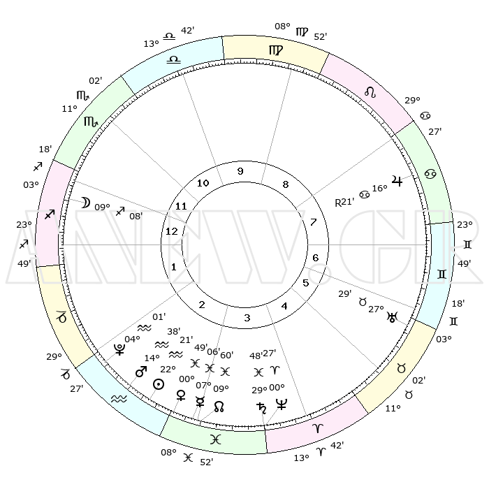 | | ΘΕΣΕΙΣ ΠΛΑΝΗΤΩΝ ΑΣΤΡΟΛΟΓΙΚΟΥ ΧΑΡΤΗ ΤΗΣ ΣΤΙΓΜΗΣ ΑΥΤΗΣ | | | | Πλανήτης | Ζώδιο | Μοίρες | Δεκαήμ. | Σε οίκο | Απόκλιση | | Ακμές των οίκων | | Ηλιος | Υδροχόος | 22°16' | Τρίτο | 3 | 14 S 05 | | 1ος | 03°19' | Τοξότης | | Σελήνη | Τοξότης | 08°21' | Πρώτο | 1 | 26 S 53 | | 2ος | 04°55' | Αιγόκερως | | Ερμής | Ιχθείς | 06°59' | Πρώτο | 3 | 09 S 38 | | 3ος | 11°11' | Υδροχόος | | Αφροδίτη | Ιχθείς | 00°44' | Πρώτο | 3 | 12 S 34 | | 4ος | 17°16' | Ιχθείς | | Αρης | Υδροχόος | 14°35' | Δεύτερο | 3 | 17 S 29 | | 5ος | 17°52' | Κριός | | Δίας | Καρκίνος | 16°21'R | Δεύτερο | 8 | 22 N 45 | | 6ος | 12°29' | Ταύρος | | Κρόνος | Ιχθείς | 29°47' | Τρίτο | 4 | 02 S 04 | | 7ος | 03°19' | Δίδυμοι | | Ουρανός | Ταύρος | 27°29' | Τρίτο | 6 | 19 N 25 | | 8ος | 04°55' | Καρκίνος | | Ποσειδώνας | Κριός | 00°26' | Πρώτο | 4 | 01 S 02 | | 9ος | 11°11' | Λέων | | Πλούτωνας | Υδροχόος | 04°01' | Πρώτο | 2 | 22 S 58 | | 10ος | 17°16' | Παρθένος | | Β. Δεσμός | Ιχθείς | 09°60' | Πρώτο | 3 | 07 S 49 | | 11ος | 17°52' | Ζυγός | | Ωροσκόπος | Τοξότης | 03°19' | Πρώτο | | | 12ος | 12°29' | Σκορπιός | | Μεσουράνημα | Παρθένος | 17°16' | Δεύτερο | | | |