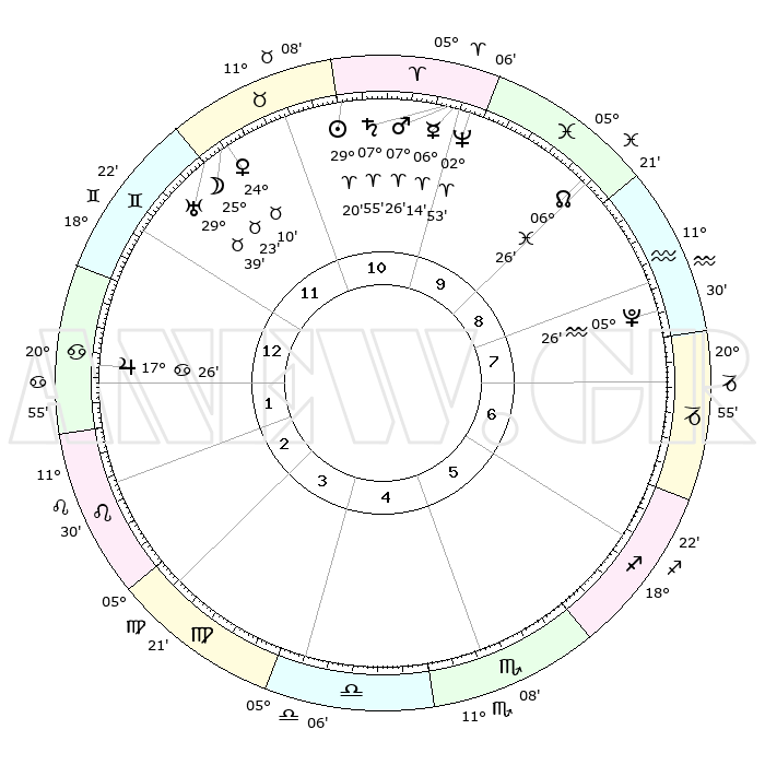 | | ΘΕΣΕΙΣ ΠΛΑΝΗΤΩΝ ΑΣΤΡΟΛΟΓΙΚΟΥ ΧΑΡΤΗ ΤΗΣ ΣΤΙΓΜΗΣ ΑΥΤΗΣ | | | | Πλανήτης | Ζώδιο | Μοίρες | Δεκαήμ. | Σε οίκο | Απόκλιση | | Ακμές των οίκων | | Ηλιος | Κριός | 29°15' | Τρίτο | 11 | 11 N 12 | | 1ος | 29°24' | Δίδυμοι | | Σελήνη | Ταύρος | 24°22' | Τρίτο | 12 | 23 N 40 | | 2ος | 20°14' | Καρκίνος | | Ερμής | Κριός | 06°08' | Πρώτο | 10 | 00 N 01 | | 3ος | 12°00' | Λέων | | Αφροδίτη | Ταύρος | 24°05' | Τρίτο | 12 | 19 N 09 | | 4ος | 08°13' | Παρθένος | | Αρης | Κριός | 07°23' | Πρώτο | 10 | 02 N 03 | | 5ος | 12°04' | Ζυγός | | Δίας | Καρκίνος | 17°26' | Δεύτερο | 1 | 22 N 41 | | 6ος | 22°06' | Σκορπιός | | Κρόνος | Κριός | 07°54' | Πρώτο | 10 | 01 N 09 | | 7ος | 29°24' | Τοξότης | | Ουρανός | Ταύρος | 29°39' | Τρίτο | 12 | 19 N 54 | | 8ος | 20°14' | Αιγόκερως | | Ποσειδώνας | Κριός | 02°53' | Πρώτο | 10 | 00 S 04 | | 9ος | 12°00' | Υδροχόος | | Πλούτωνας | Υδροχόος | 05°26' | Πρώτο | 8 | 22 S 48 | | 10ος | 08°13' | Ιχθείς | | Β. Δεσμός | Ιχθείς | 06°26' | Πρώτο | 9 | 09 S 09 | | 11ος | 12°04' | Κριός | | Ωροσκόπος | Δίδυμοι | 29°24' | Τρίτο | | | 12ος | 22°06' | Ταύρος | | Μεσουράνημα | Ιχθείς | 08°13' | Πρώτο | | | |