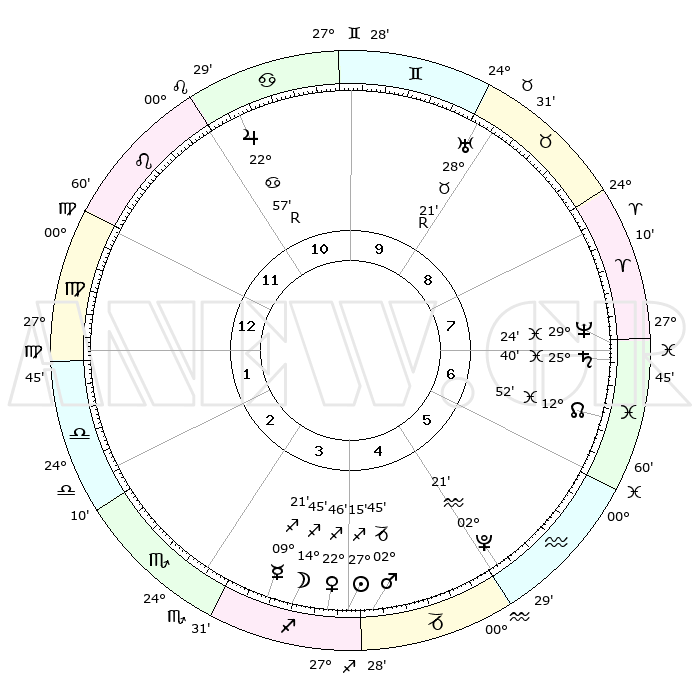 | | ΘΕΣΕΙΣ ΠΛΑΝΗΤΩΝ ΑΣΤΡΟΛΟΓΙΚΟΥ ΧΑΡΤΗ ΤΗΣ ΣΤΙΓΜΗΣ ΑΥΤΗΣ | | | | Πλανήτης | Ζώδιο | Μοίρες | Δεκαήμ. | Σε οίκο | Απόκλιση | | Ακμές των οίκων | | Ηλιος | Τοξότης | 26°49' | Τρίτο | 8 | 23 S 24 | | 1ος | 06°26' | Ταύρος | | Σελήνη | Τοξότης | 09°40' | Πρώτο | 8 | 26 S 50 | | 2ος | 06°54' | Δίδυμοι | | Ερμής | Τοξότης | 08°45' | Πρώτο | 8 | 20 S 41 | | 3ος | 29°50' | Δίδυμοι | | Αφροδίτη | Τοξότης | 22°14' | Τρίτο | 8 | 23 S 11 | | 4ος | 21°35' | Καρκίνος | | Αρης | Αιγόκερως | 02°25' | Πρώτο | 9 | 24 S 13 | | 5ος | 16°40' | Λέων | | Δίας | Καρκίνος | 22°60'R | Τρίτο | 4 | 21 N 41 | | 6ος | 20°40' | Παρθένος | | Κρόνος | Ιχθείς | 25°39' | Τρίτο | 12 | 03 S 51 | | 7ος | 06°26' | Σκορπιός | | Ουρανός | Ταύρος | 28°22'R | Τρίτο | 1 | 19 N 36 | | 8ος | 06°54' | Τοξότης | | Ποσειδώνας | Ιχθείς | 29°23' | Τρίτο | 12 | 01 S 28 | | 9ος | 29°50' | Τοξότης | | Πλούτωνας | Υδροχόος | 02°20' | Πρώτο | 10 | 23 S 18 | | 10ος | 21°35' | Αιγόκερως | | Β. Δεσμός | Ιχθείς | 12°53' | Δεύτερο | 11 | 06 S 43 | | 11ος | 16°40' | Υδροχόος | | Ωροσκόπος | Ταύρος | 06°26' | Πρώτο | | | 12ος | 20°40' | Ιχθείς | | Μεσουράνημα | Αιγόκερως | 21°35' | Τρίτο | | | |