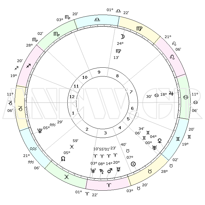 | | ΘΕΣΕΙΣ ΠΛΑΝΗΤΩΝ ΑΣΤΡΟΛΟΓΙΚΟΥ ΧΑΡΤΗ ΤΗΣ ΣΤΙΓΜΗΣ ΑΥΤΗΣ | | | | Πλανήτης | Ζώδιο | Μοίρες | Δεκαήμ. | Σε οίκο | Απόκλιση | | Ακμές των οίκων | | Ηλιος | Ταύρος | 07°36' | Πρώτο | 4 | 14 N 03 | | 1ος | 20°42' | Τοξότης | | Σελήνη | Παρθένος | 23°27' | Τρίτο | 9 | 01 N 18 | | 2ος | 25°37' | Αιγόκερως | | Ερμής | Κριός | 20°16' | Τρίτο | 4 | 05 N 51 | | 3ος | 04°39' | Ιχθείς | | Αφροδίτη | Δίδυμοι | 04°30' | Πρώτο | 6 | 21 N 47 | | 4ος | 09°51' | Κριός | | Αρης | Κριός | 13°58' | Δεύτερο | 4 | 04 N 40 | | 5ος | 07°42' | Ταύρος | | Δίας | Καρκίνος | 18°29' | Δεύτερο | 7 | 22 N 32 | | 6ος | 00°15' | Δίδυμοι | | Κρόνος | Κριός | 08°54' | Πρώτο | 3 | 01 N 32 | | 7ος | 20°42' | Δίδυμοι | | Ουρανός | Δίδυμοι | 00°06' | Πρώτο | 5 | 20 N 00 | | 8ος | 25°37' | Καρκίνος | | Ποσειδώνας | Κριός | 03°10' | Πρώτο | 3 | 00 N 03 | | 9ος | 04°39' | Παρθένος | | Πλούτωνας | Υδροχόος | 05°29' | Πρώτο | 2 | 22 S 48 | | 10ος | 09°51' | Ζυγός | | Β. Δεσμός | Ιχθείς | 05°59' | Πρώτο | 3 | 09 S 19 | | 11ος | 07°42' | Σκορπιός | | Ωροσκόπος | Τοξότης | 20°42' | Τρίτο | | | 12ος | 00°15' | Τοξότης | | Μεσουράνημα | Ζυγός | 09°51' | Πρώτο | | | |