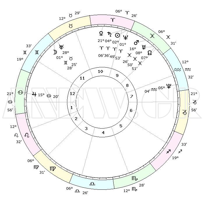 | | ΘΕΣΕΙΣ ΠΛΑΝΗΤΩΝ ΑΣΤΡΟΛΟΓΙΚΟΥ ΧΑΡΤΗ ΤΗΣ ΣΤΙΓΜΗΣ ΑΥΤΗΣ | | | | Πλανήτης | Ζώδιο | Μοίρες | Δεκαήμ. | Σε οίκο | Απόκλιση | | Ακμές των οίκων | | Ηλιος | Κριός | 02°45' | Πρώτο | 10 | 01 N 06 | | 1ος | 01°53' | Καρκίνος | | Σελήνη | Δίδυμοι | 00°32' | Πρώτο | 12 | 25 N 19 | | 2ος | 22°35' | Καρκίνος | | Ερμής | Ιχθείς | 08°49' | Πρώτο | 9 | 07 S 55 | | 3ος | 14°30' | Λέων | | Αφροδίτη | Κριός | 21°01' | Τρίτο | 11 | 07 N 29 | | 4ος | 11°08' | Παρθένος | | Αρης | Ιχθείς | 16°22' | Δεύτερο | 10 | 06 S 22 | | 5ος | 15°22' | Ζυγός | | Δίας | Καρκίνος | 15°20' | Δεύτερο | 1 | 22 N 55 | | 6ος | 25°13' | Σκορπιός | | Κρόνος | Κριός | 04°35' | Πρώτο | 10 | 00 S 08 | | 7ος | 01°53' | Αιγόκερως | | Ουρανός | Ταύρος | 28°25' | Τρίτο | 12 | 19 N 38 | | 8ος | 22°35' | Αιγόκερως | | Ποσειδώνας | Κριός | 01°53' | Πρώτο | 10 | 00 S 27 | | 9ος | 14°30' | Υδροχόος | | Πλούτωνας | Υδροχόος | 05°04' | Πρώτο | 8 | 22 S 48 | | 10ος | 11°08' | Ιχθείς | | Β. Δεσμός | Ιχθείς | 07°52' | Πρώτο | 9 | 08 S 37 | | 11ος | 15°22' | Κριός | | Ωροσκόπος | Καρκίνος | 01°53' | Πρώτο | | | 12ος | 25°13' | Ταύρος | | Μεσουράνημα | Ιχθείς | 11°08' | Δεύτερο | | | |