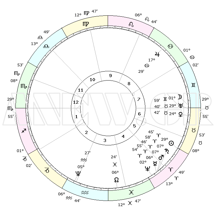 | | ΘΕΣΕΙΣ ΠΛΑΝΗΤΩΝ ΑΣΤΡΟΛΟΓΙΚΟΥ ΧΑΡΤΗ ΤΗΣ ΣΤΙΓΜΗΣ ΑΥΤΗΣ | | | | Πλανήτης | Ζώδιο | Μοίρες | Δεκαήμ. | Σε οίκο | Απόκλιση | | Ακμές των οίκων | | Ηλιος | Κριός | 29°41' | Τρίτο | 6 | 11 N 22 | | 1ος | 10°11' | Σκορπιός | | Σελήνη | Δίδυμοι | 00°58' | Πρώτο | 7 | 25 N 18 | | 2ος | 09°16' | Τοξότης | | Ερμής | Κριός | 06°48' | Πρώτο | 5 | 00 N 17 | | 3ος | 12°11' | Αιγόκερως | | Αφροδίτη | Ταύρος | 24°37' | Τρίτο | 7 | 19 N 18 | | 4ος | 17°06' | Υδροχόος | | Αρης | Κριός | 07°43' | Πρώτο | 5 | 02 N 11 | | 5ος | 19°46' | Ιχθείς | | Δίας | Καρκίνος | 17°29' | Δεύτερο | 9 | 22 N 40 | | 6ος | 17°23' | Κριός | | Κρόνος | Κριός | 07°57' | Πρώτο | 5 | 01 N 11 | | 7ος | 10°11' | Ταύρος | | Ουρανός | Ταύρος | 29°40' | Τρίτο | 7 | 19 N 55 | | 8ος | 09°16' | Δίδυμοι | | Ποσειδώνας | Κριός | 02°53' | Πρώτο | 5 | 00 S 03 | | 9ος | 12°11' | Καρκίνος | | Πλούτωνας | Υδροχόος | 05°27' | Πρώτο | 3 | 22 S 48 | | 10ος | 17°06' | Λέων | | Β. Δεσμός | Ιχθείς | 06°25' | Πρώτο | 4 | 09 S 09 | | 11ος | 19°46' | Παρθένος | | Ωροσκόπος | Σκορπιός | 10°11' | Δεύτερο | | | 12ος | 17°23' | Ζυγός | | Μεσουράνημα | Λέων | 17°06' | Δεύτερο | | | |