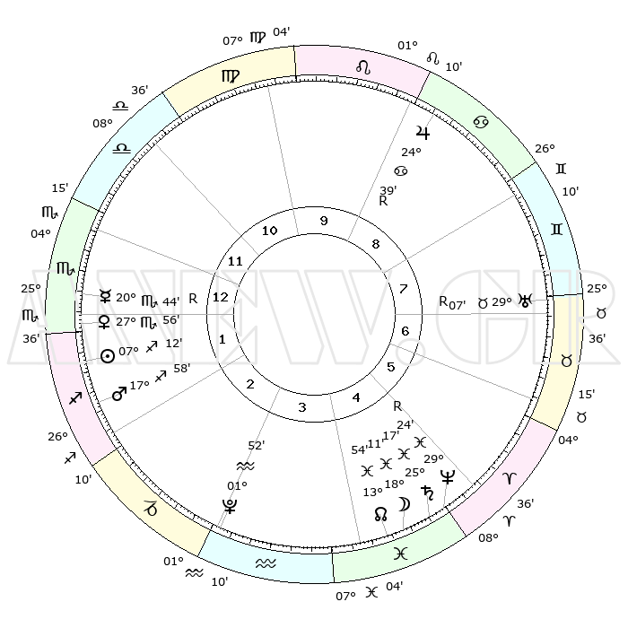 | | ΘΕΣΕΙΣ ΠΛΑΝΗΤΩΝ ΑΣΤΡΟΛΟΓΙΚΟΥ ΧΑΡΤΗ ΤΗΣ ΣΤΙΓΜΗΣ ΑΥΤΗΣ | | | | Πλανήτης | Ζώδιο | Μοίρες | Δεκαήμ. | Σε οίκο | Απόκλιση | | Ακμές των οίκων | | Ηλιος | Τοξότης | 07°09' | Πρώτο | 1 | 21 S 30 | | 1ος | 10°31' | Σκορπιός | | Σελήνη | Ιχθείς | 17°29' | Δεύτερο | 4 | 04 S 41 | | 2ος | 09°38' | Τοξότης | | Ερμής | Σκορπιός | 20°44'R | Τρίτο | 1 | 15 S 31 | | 3ος | 12°35' | Αιγόκερως | | Αφροδίτη | Σκορπιός | 27°52' | Τρίτο | 1 | 18 S 56 | | 4ος | 17°32' | Υδροχόος | | Αρης | Τοξότης | 17°55' | Δεύτερο | 2 | 23 S 32 | | 5ος | 20°11' | Ιχθείς | | Δίας | Καρκίνος | 24°39'R | Τρίτο | 9 | 21 N 20 | | 6ος | 17°46' | Κριός | | Κρόνος | Ιχθείς | 25°17' | Τρίτο | 5 | 04 S 03 | | 7ος | 10°31' | Ταύρος | | Ουρανός | Ταύρος | 29°07'R | Τρίτο | 7 | 19 N 45 | | 8ος | 09°38' | Δίδυμοι | | Ποσειδώνας | Ιχθείς | 29°24'R | Τρίτο | 5 | 01 S 29 | | 9ος | 12°35' | Καρκίνος | | Πλούτωνας | Υδροχόος | 01°52' | Πρώτο | 3 | 23 S 25 | | 10ος | 17°32' | Λέων | | Β. Δεσμός | Ιχθείς | 13°55' | Δεύτερο | 4 | 06 S 20 | | 11ος | 20°11' | Παρθένος | | Ωροσκόπος | Σκορπιός | 10°31' | Δεύτερο | | | 12ος | 17°46' | Ζυγός | | Μεσουράνημα | Λέων | 17°32' | Δεύτερο | | | |
