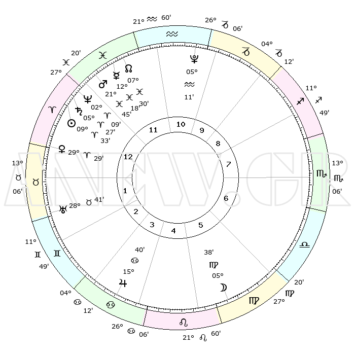 | | ΘΕΣΕΙΣ ΠΛΑΝΗΤΩΝ ΑΣΤΡΟΛΟΓΙΚΟΥ ΧΑΡΤΗ ΤΗΣ ΣΤΙΓΜΗΣ ΑΥΤΗΣ | | | | Πλανήτης | Ζώδιο | Μοίρες | Δεκαήμ. | Σε οίκο | Απόκλιση | | Ακμές των οίκων | | Ηλιος | Κριός | 09°28' | Πρώτο | 1 | 03 N 45 | | 1ος | 00°27' | Κριός | | Σελήνη | Παρθένος | 04°37' | Πρώτο | 6 | 10 N 10 | | 2ος | 10°38' | Ταύρος | | Ερμής | Ιχθείς | 12°15' | Δεύτερο | 12 | 07 S 53 | | 3ος | 07°58' | Δίδυμοι | | Αφροδίτη | Κριός | 29°23' | Τρίτο | 1 | 10 N 46 | | 4ος | 00°15' | Καρκίνος | | Αρης | Ιχθείς | 21°41' | Τρίτο | 12 | 04 S 16 | | 5ος | 22°34' | Καρκίνος | | Δίας | Καρκίνος | 15°40' | Δεύτερο | 4 | 22 N 53 | | 6ος | 20°03' | Λέων | | Κρόνος | Κριός | 05°26' | Πρώτο | 1 | 00 N 12 | | 7ος | 00°27' | Ζυγός | | Ουρανός | Ταύρος | 28°41' | Τρίτο | 2 | 19 N 42 | | 8ος | 10°38' | Σκορπιός | | Ποσειδώνας | Κριός | 02°08' | Πρώτο | 1 | 00 S 21 | | 9ος | 07°58' | Τοξότης | | Πλούτωνας | Υδροχόος | 05°11' | Πρώτο | 11 | 22 S 48 | | 10ος | 00°15' | Αιγόκερως | | Β. Δεσμός | Ιχθείς | 07°30' | Πρώτο | 12 | 08 S 45 | | 11ος | 22°34' | Αιγόκερως | | Ωροσκόπος | Κριός | 00°27' | Πρώτο | | | 12ος | 20°03' | Υδροχόος | | Μεσουράνημα | Αιγόκερως | 00°15' | Πρώτο | | | |