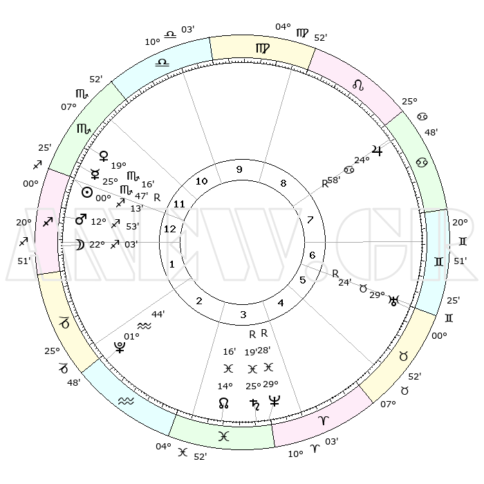 | | ΘΕΣΕΙΣ ΠΛΑΝΗΤΩΝ ΑΣΤΡΟΛΟΓΙΚΟΥ ΧΑΡΤΗ ΤΗΣ ΣΤΙΓΜΗΣ ΑΥΤΗΣ | | | | Πλανήτης | Ζώδιο | Μοίρες | Δεκαήμ. | Σε οίκο | Απόκλιση | | Ακμές των οίκων | | Ηλιος | Τοξότης | 00°10' | Πρώτο | 12 | 20 S 11 | | 1ος | 03°25' | Τοξότης | | Σελήνη | Τοξότης | 21°21' | Τρίτο | 1 | 28 S 07 | | 2ος | 05°03' | Αιγόκερως | | Ερμής | Σκορπιός | 25°52'R | Τρίτο | 12 | 18 S 06 | | 3ος | 11°19' | Υδροχόος | | Αφροδίτη | Σκορπιός | 19°11' | Δεύτερο | 12 | 16 S 33 | | 4ος | 17°25' | Ιχθείς | | Αρης | Τοξότης | 12°50' | Δεύτερο | 1 | 22 S 55 | | 5ος | 18°00' | Κριός | | Δίας | Καρκίνος | 24°58'R | Τρίτο | 8 | 21 N 16 | | 6ος | 12°35' | Ταύρος | | Κρόνος | Ιχθείς | 25°19'R | Τρίτο | 4 | 04 S 04 | | 7ος | 03°25' | Δίδυμοι | | Ουρανός | Ταύρος | 29°25'R | Τρίτο | 6 | 19 N 49 | | 8ος | 05°03' | Καρκίνος | | Ποσειδώνας | Ιχθείς | 29°28'R | Τρίτο | 4 | 01 S 28 | | 9ος | 11°19' | Λέων | | Πλούτωνας | Υδροχόος | 01°44' | Πρώτο | 2 | 23 S 26 | | 10ος | 17°25' | Παρθένος | | Β. Δεσμός | Ιχθείς | 14°16' | Δεύτερο | 3 | 06 S 11 | | 11ος | 18°00' | Ζυγός | | Ωροσκόπος | Τοξότης | 03°25' | Πρώτο | | | 12ος | 12°35' | Σκορπιός | | Μεσουράνημα | Παρθένος | 17°25' | Δεύτερο | | | |