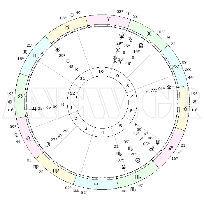 | | ΘΕΣΕΙΣ ΠΛΑΝΗΤΩΝ ΑΣΤΡΟΛΟΓΙΚΟΥ ΧΑΡΤΗ ΤΗΣ ΣΤΙΓΜΗΣ ΑΥΤΗΣ | | | | Πλανήτης | Ζώδιο | Μοίρες | Δεκαήμ. | Σε οίκο | Απόκλιση | | Ακμές των οίκων | | Ηλιος | Σκορπιός | 20°35' | Τρίτο | 6 | 17 S 53 | | 1ος | 25°22' | Δίδυμοι | | Σελήνη | Λέων | 26°31' | Τρίτο | 3 | 14 N 17 | | 2ος | 16°30' | Καρκίνος | | Ερμής | Τοξότης | 06°12'R | Πρώτο | 6 | 23 S 07 | | 3ος | 08°02' | Λέων | | Αφροδίτη | Σκορπιός | 07°15' | Πρώτο | 5 | 12 S 44 | | 4ος | 03°38' | Παρθένος | | Αρης | Τοξότης | 05°54' | Πρώτο | 6 | 21 S 47 | | 5ος | 06°48' | Ζυγός | | Δίας | Καρκίνος | 25°09'R | Τρίτο | 2 | 21 N 13 | | 6ος | 17°03' | Σκορπιός | | Κρόνος | Ιχθείς | 25°30'R | Τρίτο | 10 | 04 S 01 | | 7ος | 25°22' | Τοξότης | | Ουρανός | Ταύρος | 29°48'R | Τρίτο | 12 | 19 N 54 | | 8ος | 16°30' | Αιγόκερως | | Ποσειδώνας | Ιχθείς | 29°35'R | Τρίτο | 10 | 01 S 25 | | 9ος | 08°02' | Υδροχόος | | Πλούτωνας | Υδροχόος | 01°35' | Πρώτο | 8 | 23 S 29 | | 10ος | 03°38' | Ιχθείς | | Β. Δεσμός | Ιχθείς | 14°47' | Δεύτερο | 10 | 06 S 00 | | 11ος | 06°48' | Κριός | | Ωροσκόπος | Δίδυμοι | 25°22' | Τρίτο | | | 12ος | 17°03' | Ταύρος | | Μεσουράνημα | Ιχθείς | 03°38' | Πρώτο | | | |