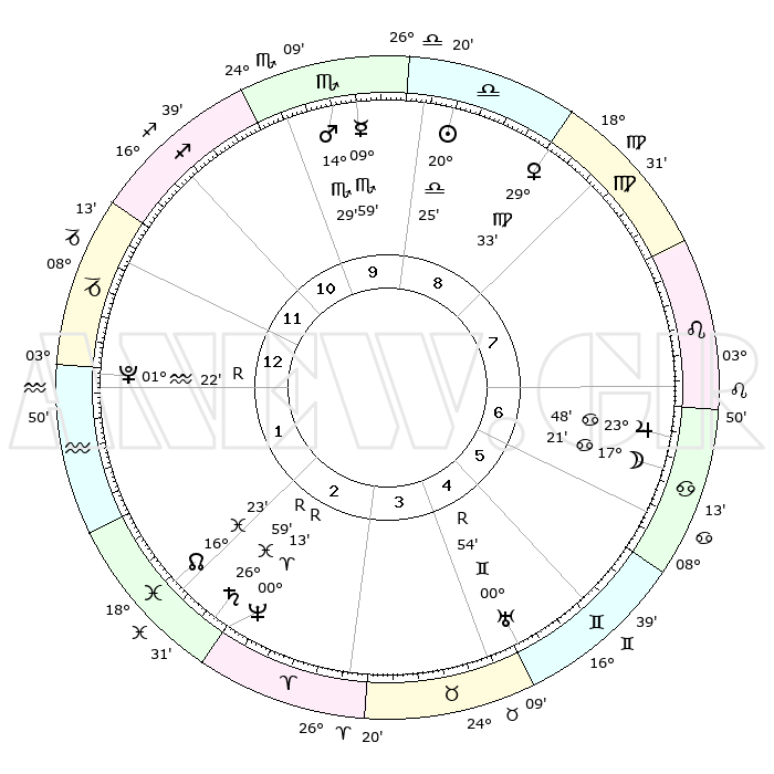 | ΘΕΣΕΙΣ ΠΛΑΝΗΤΩΝ ΑΣΤΡΟΛΟΓΙΚΟΥ ΧΑΡΤΗ ΤΗΣ ΣΤΙΓΜΗΣ ΑΥΤΗΣ | | Πλανήτης | Ζώδιο | Μοίρες | Δεκαήμ. | Σε οίκο | Απόκλιση | | Ακμές των οίκων | Ηλιος | Ζυγός | 20°19' | Τρίτο | 10 | 07 S 56 | | 1ος | 23°26' | Τοξότης | Σελήνη | Καρκίνος | 15°50' | Δεύτερο | 7 | 27 N 04 | | 2ος | 28°58' | Αιγόκερως | Ερμής | Σκορπιός | 09°50' | Πρώτο | 10 | 16 S 14 | | 3ος | 08°21' | Ιχθείς | Αφροδίτη | Παρθένος | 29°25' | Τρίτο | 9 | 01 N 36 | | 4ος | 13°14' | Κριός | Αρης | Σκορπιός | 14°24' | Δεύτερο | 11 | 16 S 21 | | 5ος | 10°37' | Ταύρος | Δίας | Καρκίνος | 23°47' | Τρίτο | 7 | 21 N 23 | | 6ος | 02°55' | Δίδυμοι | Κρόνος | Ιχθείς | 26°60'R | Τρίτο | 3 | 03 S 30 | | 7ος | 23°26' | Δίδυμοι | Ουρανός | Δίδυμοι | 00°54'R | Πρώτο | 5 | 20 N 08 | | 8ος | 28°58' | Καρκίνος | Ποσειδώνας | Κριός | 00°13'R | Πρώτο | 3 | 01 S 10 | | 9ος | 08°21' | Παρθένος | Πλούτωνας | Υδροχόος | 01°22'R | Πρώτο | 2 | 23 S 32 | | 10ος | 13°14' | Ζυγός | Β. Δεσμός | Ιχθείς | 16°23' | Δεύτερο | 3 | 05 S 22 | | 11ος | 10°37' | Σκορπιός | Ωροσκόπος | Τοξότης | 23°26' | Τρίτο | | | 12ος | 02°55' | Τοξότης | Μεσουράνημα | Ζυγός | 13°14' | Δεύτερο | | | |