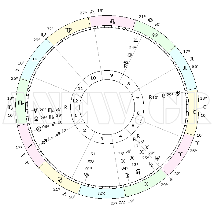 | | ΘΕΣΕΙΣ ΠΛΑΝΗΤΩΝ ΑΣΤΡΟΛΟΓΙΚΟΥ ΧΑΡΤΗ ΤΗΣ ΣΤΙΓΜΗΣ ΑΥΤΗΣ | | | | Πλανήτης | Ζώδιο | Μοίρες | Δεκαήμ. | Σε οίκο | Απόκλιση | | Ακμές των οίκων | | Ηλιος | Τοξότης | 06°08' | Πρώτο | 1 | 21 S 20 | | 1ος | 09°19' | Σκορπιός | | Σελήνη | Ιχθείς | 04°12' | Πρώτο | 4 | 10 S 48 | | 2ος | 08°21' | Τοξότης | | Ερμής | Σκορπιός | 20°57'R | Τρίτο | 1 | 15 S 40 | | 3ος | 11°10' | Αιγόκερως | | Αφροδίτη | Σκορπιός | 26°36' | Τρίτο | 1 | 18 S 36 | | 4ος | 16°02' | Υδροχόος | | Αρης | Τοξότης | 17°11' | Δεύτερο | 2 | 23 S 27 | | 5ος | 18°44' | Ιχθείς | | Δίας | Καρκίνος | 24°42'R | Τρίτο | 9 | 21 N 20 | | 6ος | 16°27' | Κριός | | Κρόνος | Ιχθείς | 25°17'R | Τρίτο | 5 | 04 S 04 | | 7ος | 09°19' | Ταύρος | | Ουρανός | Ταύρος | 29°10'R | Τρίτο | 7 | 19 N 46 | | 8ος | 08°21' | Δίδυμοι | | Ποσειδώνας | Ιχθείς | 29°25'R | Τρίτο | 5 | 01 S 29 | | 9ος | 11°10' | Καρκίνος | | Πλούτωνας | Υδροχόος | 01°51' | Πρώτο | 3 | 23 S 25 | | 10ος | 16°02' | Λέων | | Β. Δεσμός | Ιχθείς | 13°58' | Δεύτερο | 4 | 06 S 18 | | 11ος | 18°44' | Παρθένος | | Ωροσκόπος | Σκορπιός | 09°19' | Πρώτο | | | 12ος | 16°27' | Ζυγός | | Μεσουράνημα | Λέων | 16°02' | Δεύτερο | | | |