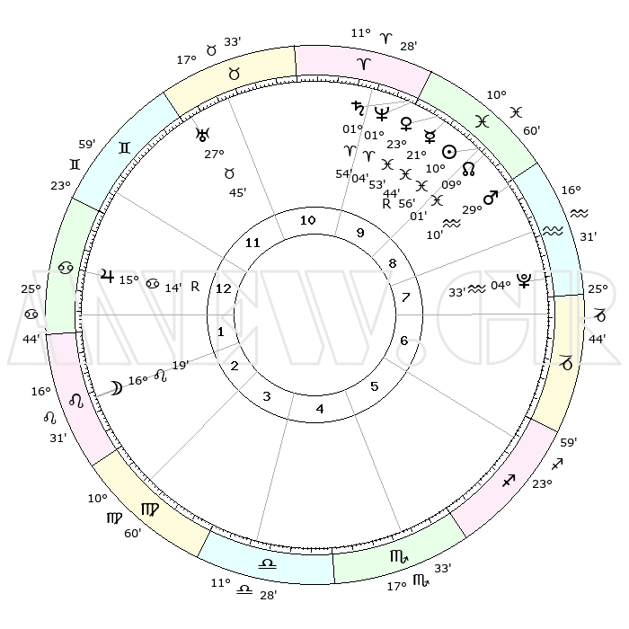 | | ΘΕΣΕΙΣ ΠΛΑΝΗΤΩΝ ΑΣΤΡΟΛΟΓΙΚΟΥ ΧΑΡΤΗ ΤΗΣ ΣΤΙΓΜΗΣ ΑΥΤΗΣ | | | | Πλανήτης | Ζώδιο | Μοίρες | Δεκαήμ. | Σε οίκο | Απόκλιση | | Ακμές των οίκων | | Ηλιος | Ιχθείς | 10°53' | Δεύτερο | 9 | 07 S 29 | | 1ος | 08°01' | Καρκίνος | | Σελήνη | Λέων | 15°30' | Δεύτερο | 2 | 18 N 12 | | 2ος | 28°29' | Καρκίνος | | Ερμής | Ιχθείς | 21°46'R | Τρίτο | 10 | 00 S 10 | | 3ος | 20°55' | Λέων | | Αφροδίτη | Ιχθείς | 23°48' | Τρίτο | 10 | 03 S 42 | | 4ος | 18°34' | Παρθένος | | Αρης | Υδροχόος | 29°07' | Τρίτο | 9 | 12 S 48 | | 5ος | 23°37' | Ζυγός | | Δίας | Καρκίνος | 15°14'R | Δεύτερο | 1 | 22 N 54 | | 6ος | 02°49' | Τοξότης | | Κρόνος | Κριός | 01°54' | Πρώτο | 10 | 01 S 12 | | 7ος | 08°01' | Αιγόκερως | | Ουρανός | Ταύρος | 27°45' | Τρίτο | 11 | 19 N 29 | | 8ος | 28°29' | Αιγόκερως | | Ποσειδώνας | Κριός | 01°04' | Πρώτο | 10 | 00 S 47 | | 9ος | 20°55' | Υδροχόος | | Πλούτωνας | Υδροχόος | 04°33' | Πρώτο | 8 | 22 S 52 | | 10ος | 18°34' | Ιχθείς | | Β. Δεσμός | Ιχθείς | 09°01' | Πρώτο | 9 | 08 S 11 | | 11ος | 23°37' | Κριός | | Ωροσκόπος | Καρκίνος | 08°01' | Πρώτο | | | 12ος | 02°49' | Δίδυμοι | | Μεσουράνημα | Ιχθείς | 18°34' | Δεύτερο | | | |