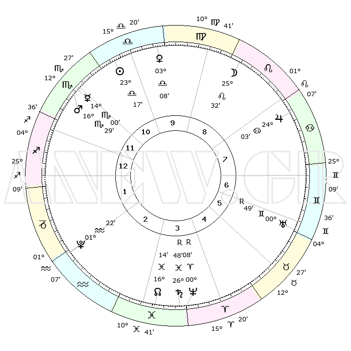 | ΘΕΣΕΙΣ ΠΛΑΝΗΤΩΝ ΑΣΤΡΟΛΟΓΙΚΟΥ ΧΑΡΤΗ ΤΗΣ ΣΤΙΓΜΗΣ ΑΥΤΗΣ | | Πλανήτης | Ζώδιο | Μοίρες | Δεκαήμ. | Σε οίκο | Απόκλιση | | Ακμές των οίκων | Ηλιος | Ζυγός | 23°08' | Τρίτο | 12 | 08 S 59 | | 1ος | 08°06' | Σκορπιός | Σελήνη | Λέων | 23°31' | Τρίτο | 10 | 15 N 43 | | 2ος | 07°02' | Τοξότης | Ερμής | Σκορπιός | 13°47' | Δεύτερο | 1 | 17 S 45 | | 3ος | 09°44' | Αιγόκερως | Αφροδίτη | Ζυγός | 02°56' | Πρώτο | 11 | 00 N 14 | | 4ος | 14°30' | Υδροχόος | Αρης | Σκορπιός | 16°22' | Δεύτερο | 1 | 16 S 57 | | 5ος | 17°15' | Ιχθείς | Δίας | Καρκίνος | 24°02' | Τρίτο | 9 | 21 N 21 | | 6ος | 15°06' | Κριός | Κρόνος | Ιχθείς | 26°48'R | Τρίτο | 5 | 03 S 34 | | 7ος | 08°06' | Ταύρος | Ουρανός | Δίδυμοι | 00°49'R | Πρώτο | 7 | 20 N 07 | | 8ος | 07°02' | Δίδυμοι | Ποσειδώνας | Κριός | 00°09'R | Πρώτο | 5 | 01 S 12 | | 9ος | 09°44' | Καρκίνος | Πλούτωνας | Υδροχόος | 01°22' | Πρώτο | 3 | 23 S 32 | | 10ος | 14°30' | Λέων | Β. Δεσμός | Ιχθείς | 16°14' | Δεύτερο | 4 | 05 S 26 | | 11ος | 17°15' | Παρθένος | Ωροσκόπος | Σκορπιός | 08°06' | Πρώτο | | | 12ος | 15°06' | Ζυγός | Μεσουράνημα | Λέων | 14°30' | Δεύτερο | | | |