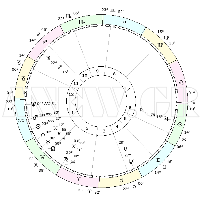 | | ΘΕΣΕΙΣ ΠΛΑΝΗΤΩΝ ΑΣΤΡΟΛΟΓΙΚΟΥ ΧΑΡΤΗ ΤΗΣ ΣΤΙΓΜΗΣ ΑΥΤΗΣ | | | | Πλανήτης | Ζώδιο | Μοίρες | Δεκαήμ. | Σε οίκο | Απόκλιση | | Ακμές των οίκων | | Ηλιος | Υδροχόος | 23°19' | Τρίτο | 3 | 13 S 45 | | 1ος | 11°59' | Τοξότης | | Σελήνη | Τοξότης | 20°34' | Τρίτο | 1 | 28 S 14 | | 2ος | 15°04' | Αιγόκερως | | Ερμής | Ιχθείς | 08°41' | Πρώτο | 3 | 08 S 49 | | 3ος | 22°48' | Υδροχόος | | Αφροδίτη | Ιχθείς | 02°01' | Πρώτο | 3 | 12 S 07 | | 4ος | 28°42' | Ιχθείς | | Αρης | Υδροχόος | 15°24' | Δεύτερο | 2 | 17 S 14 | | 5ος | 27°60' | Κριός | | Δίας | Καρκίνος | 16°16'R | Δεύτερο | 8 | 22 N 46 | | 6ος | 21°30' | Ταύρος | | Κρόνος | Ιχθείς | 29°54' | Τρίτο | 4 | 02 S 01 | | 7ος | 11°59' | Δίδυμοι | | Ουρανός | Ταύρος | 27°29' | Τρίτο | 6 | 19 N 25 | | 8ος | 15°04' | Καρκίνος | | Ποσειδώνας | Κριός | 00°28' | Πρώτο | 4 | 01 S 01 | | 9ος | 22°48' | Λέων | | Πλούτωνας | Υδροχόος | 04°03' | Πρώτο | 2 | 22 S 57 | | 10ος | 28°42' | Παρθένος | | Β. Δεσμός | Ιχθείς | 09°57' | Πρώτο | 3 | 07 S 50 | | 11ος | 27°60' | Ζυγός | | Ωροσκόπος | Τοξότης | 11°59' | Δεύτερο | | | 12ος | 21°30' | Σκορπιός | | Μεσουράνημα | Παρθένος | 28°42' | Τρίτο | | | |