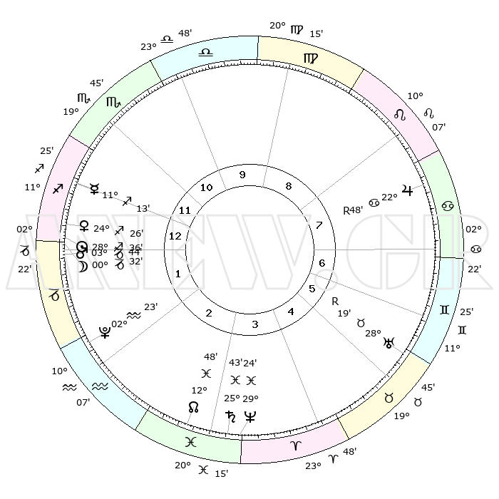 | | ΘΕΣΕΙΣ ΠΛΑΝΗΤΩΝ ΑΣΤΡΟΛΟΓΙΚΟΥ ΧΑΡΤΗ ΤΗΣ ΣΤΙΓΜΗΣ ΑΥΤΗΣ | | | | Πλανήτης | Ζώδιο | Μοίρες | Δεκαήμ. | Σε οίκο | Απόκλιση | | Ακμές των οίκων | | Ηλιος | Τοξότης | 28°31' | Τρίτο | 1 | 23 S 25 | | 1ος | 07°58' | Τοξότης | | Σελήνη | Τοξότης | 29°36' | Τρίτο | 1 | 28 S 12 | | 2ος | 10°19' | Αιγόκερως | | Ερμής | Τοξότης | 11°06' | Δεύτερο | 1 | 21 S 14 | | 3ος | 17°22' | Υδροχόος | | Αφροδίτη | Τοξότης | 24°20' | Τρίτο | 1 | 23 S 21 | | 4ος | 23°25' | Ιχθείς | | Αρης | Αιγόκερως | 03°41' | Πρώτο | 1 | 24 S 12 | | 5ος | 23°21' | Κριός | | Δίας | Καρκίνος | 22°48'R | Τρίτο | 8 | 21 N 43 | | 6ος | 17°21' | Ταύρος | | Κρόνος | Ιχθείς | 25°43' | Τρίτο | 4 | 03 S 49 | | 7ος | 07°58' | Δίδυμοι | | Ουρανός | Ταύρος | 28°19'R | Τρίτο | 6 | 19 N 35 | | 8ος | 10°19' | Καρκίνος | | Ποσειδώνας | Ιχθείς | 29°24' | Τρίτο | 4 | 01 S 28 | | 9ος | 17°22' | Λέων | | Πλούτωνας | Υδροχόος | 02°23' | Πρώτο | 2 | 23 S 18 | | 10ος | 23°25' | Παρθένος | | Β. Δεσμός | Ιχθείς | 12°48' | Δεύτερο | 3 | 06 S 45 | | 11ος | 23°21' | Ζυγός | | Ωροσκόπος | Τοξότης | 07°58' | Πρώτο | | | 12ος | 17°21' | Σκορπιός | | Μεσουράνημα | Παρθένος | 23°25' | Τρίτο | | | |