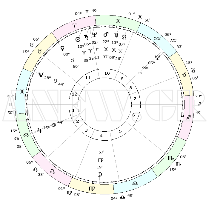 | | ΘΕΣΕΙΣ ΠΛΑΝΗΤΩΝ ΑΣΤΡΟΛΟΓΙΚΟΥ ΧΑΡΤΗ ΤΗΣ ΣΤΙΓΜΗΣ ΑΥΤΗΣ | | | | Πλανήτης | Ζώδιο | Μοίρες | Δεκαήμ. | Σε οίκο | Απόκλιση | | Ακμές των οίκων | | Ηλιος | Κριός | 10°34' | Δεύτερο | 11 | 04 N 11 | | 1ος | 01°07' | Δίδυμοι | | Σελήνη | Παρθένος | 19°10' | Δεύτερο | 5 | 03 N 25 | | 2ος | 25°42' | Δίδυμοι | | Ερμής | Ιχθείς | 13°06' | Δεύτερο | 11 | 07 S 44 | | 3ος | 17°05' | Καρκίνος | | Αφροδίτη | Ταύρος | 00°46' | Πρώτο | 12 | 11 N 18 | | 4ος | 09°56' | Λέων | | Αρης | Ιχθείς | 22°34' | Τρίτο | 11 | 03 S 55 | | 5ος | 08°35' | Παρθένος | | Δίας | Καρκίνος | 15°44' | Δεύτερο | 2 | 22 N 52 | | 6ος | 17°12' | Ζυγός | | Κρόνος | Κριός | 05°34' | Πρώτο | 11 | 00 N 15 | | 7ος | 01°07' | Τοξότης | | Ουρανός | Ταύρος | 28°44' | Τρίτο | 12 | 19 N 42 | | 8ος | 25°42' | Τοξότης | | Ποσειδώνας | Κριός | 02°11' | Πρώτο | 11 | 00 S 20 | | 9ος | 17°05' | Αιγόκερως | | Πλούτωνας | Υδροχόος | 05°12' | Πρώτο | 9 | 22 S 47 | | 10ος | 09°56' | Υδροχόος | | Β. Δεσμός | Ιχθείς | 07°27' | Πρώτο | 10 | 08 S 47 | | 11ος | 08°35' | Ιχθείς | | Ωροσκόπος | Δίδυμοι | 01°07' | Πρώτο | | | 12ος | 17°12' | Κριός | | Μεσουράνημα | Υδροχόος | 09°56' | Πρώτο | | | |