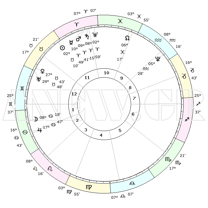 | | ΘΕΣΕΙΣ ΠΛΑΝΗΤΩΝ ΑΣΤΡΟΛΟΓΙΚΟΥ ΧΑΡΤΗ ΤΗΣ ΣΤΙΓΜΗΣ ΑΥΤΗΣ | | | | Πλανήτης | Ζώδιο | Μοίρες | Δεκαήμ. | Σε οίκο | Απόκλιση | | Ακμές των οίκων | | Ηλιος | Ταύρος | 02°06' | Πρώτο | 12 | 12 N 12 | | 1ος | 01°33' | Δίδυμοι | | Σελήνη | Καρκίνος | 07°23' | Πρώτο | 2 | 27 N 39 | | 2ος | 26°03' | Δίδυμοι | | Ερμής | Κριός | 10°43' | Δεύτερο | 11 | 01 N 53 | | 3ος | 17°25' | Καρκίνος | | Αφροδίτη | Ταύρος | 27°38' | Τρίτο | 12 | 20 N 07 | | 4ος | 10°18' | Λέων | | Αρης | Κριός | 09°38' | Πρώτο | 11 | 02 N 57 | | 5ος | 09°02' | Παρθένος | | Δίας | Καρκίνος | 17°46' | Δεύτερο | 3 | 22 N 38 | | 6ος | 17°43' | Ζυγός | | Κρόνος | Κριός | 08°15' | Πρώτο | 11 | 01 N 17 | | 7ος | 01°33' | Τοξότης | | Ουρανός | Ταύρος | 29°48' | Τρίτο | 12 | 19 N 56 | | 8ος | 26°03' | Τοξότης | | Ποσειδώνας | Κριός | 02°59' | Πρώτο | 11 | 00 S 01 | | 9ος | 17°25' | Αιγόκερως | | Πλούτωνας | Υδροχόος | 05°28' | Πρώτο | 9 | 22 S 48 | | 10ος | 10°18' | Υδροχόος | | Β. Δεσμός | Ιχθείς | 06°17' | Πρώτο | 10 | 09 S 12 | | 11ος | 09°02' | Ιχθείς | | Ωροσκόπος | Δίδυμοι | 01°33' | Πρώτο | | | 12ος | 17°43' | Κριός | | Μεσουράνημα | Υδροχόος | 10°18' | Δεύτερο | | | |