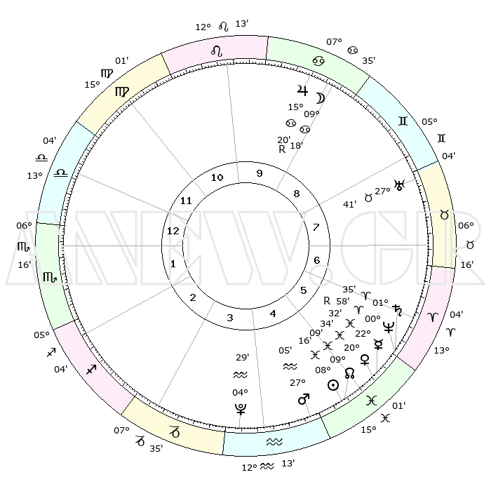 | | ΘΕΣΕΙΣ ΠΛΑΝΗΤΩΝ ΑΣΤΡΟΛΟΓΙΚΟΥ ΧΑΡΤΗ ΤΗΣ ΣΤΙΓΜΗΣ ΑΥΤΗΣ | | | | Πλανήτης | Ζώδιο | Μοίρες | Δεκαήμ. | Σε οίκο | Απόκλιση | | Ακμές των οίκων | | Ηλιος | Ιχθείς | 08°12' | Πρώτο | 5 | 08 S 29 | | 1ος | 16°37' | Ζυγός | | Σελήνη | Καρκίνος | 08°21' | Πρώτο | 9 | 27 N 46 | | 2ος | 14°15' | Σκορπιός | | Ερμής | Ιχθείς | 22°33'R | Τρίτο | 6 | 00 S 18 | | 3ος | 15°23' | Τοξότης | | Αφροδίτη | Ιχθείς | 20°29' | Τρίτο | 5 | 05 S 03 | | 4ος | 18°48' | Αιγόκερως | | Αρης | Υδροχόος | 27°01' | Τρίτο | 5 | 13 S 32 | | 5ος | 21°45' | Υδροχόος | | Δίας | Καρκίνος | 15°20'R | Δεύτερο | 9 | 22 N 53 | | 6ος | 21°25' | Ιχθείς | | Κρόνος | Κριός | 01°35' | Πρώτο | 6 | 01 S 20 | | 7ος | 16°37' | Κριός | | Ουρανός | Ταύρος | 27°41' | Τρίτο | 8 | 19 N 28 | | 8ος | 14°15' | Ταύρος | | Ποσειδώνας | Κριός | 00°58' | Πρώτο | 6 | 00 S 49 | | 9ος | 15°23' | Δίδυμοι | | Πλούτωνας | Υδροχόος | 04°29' | Πρώτο | 4 | 22 S 53 | | 10ος | 18°48' | Καρκίνος | | Β. Δεσμός | Ιχθείς | 09°10' | Πρώτο | 5 | 08 S 08 | | 11ος | 21°45' | Λέων | | Ωροσκόπος | Ζυγός | 16°37' | Δεύτερο | | | 12ος | 21°25' | Παρθένος | | Μεσουράνημα | Καρκίνος | 18°48' | Δεύτερο | | | |